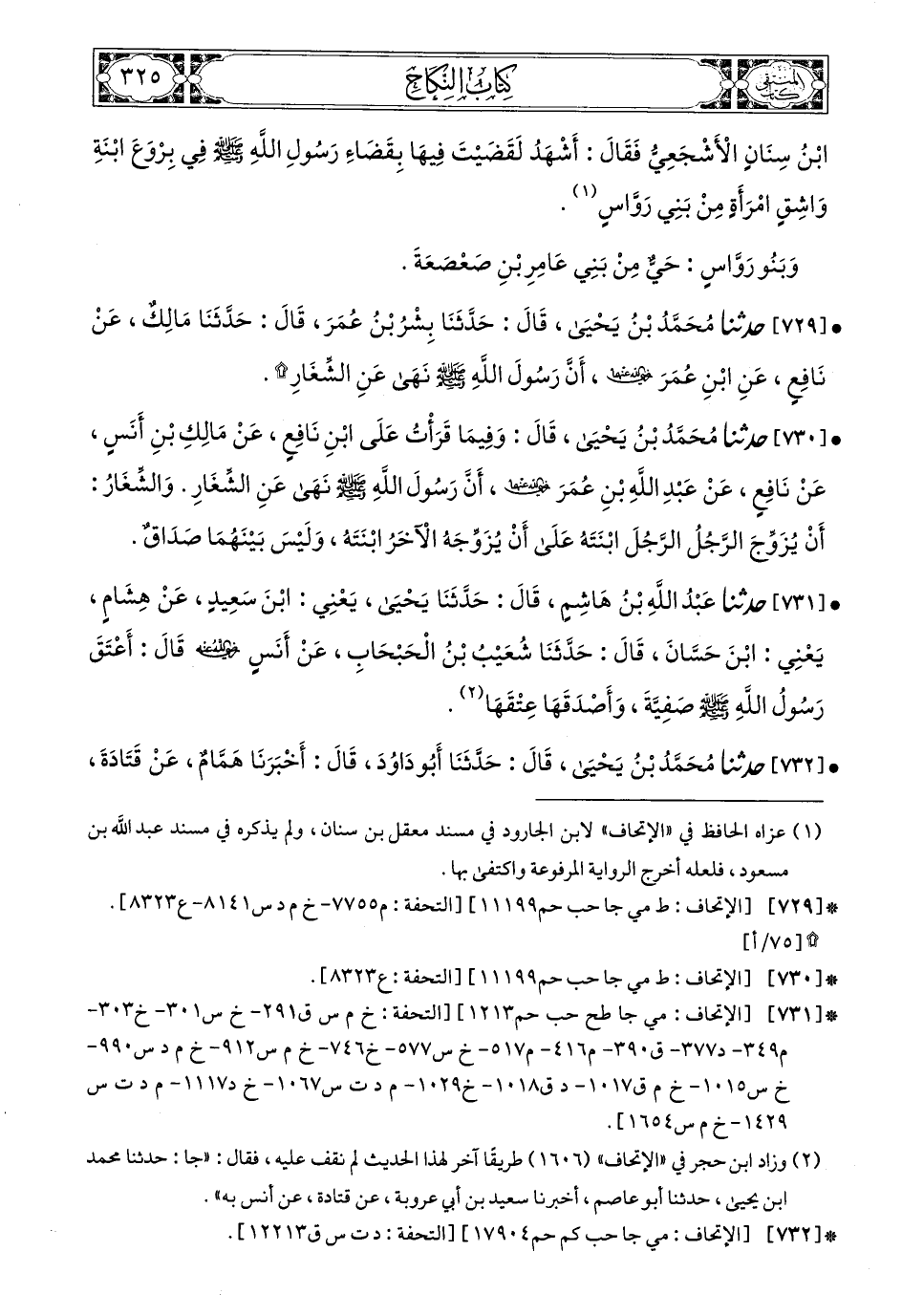 729- حَدَّثَنَا مُحَمَّدُ بْنُ يَحْيَى، قَالَ: حَدَّثَنَا بِشْرُ بْنُ عُمَرَ، قَالَ: حَدَّثَنَا مَالِكٌ، عَنْ نَافِعٍ، عَنِ ابْنِ عُمَرَ، رَضِيَ اللهُ عَنْهُمَا أَنَّ رَسُولَ اللهِ صَلى الله عَليه وسَلم نَهَى عَنِ الشِّغَارِ.