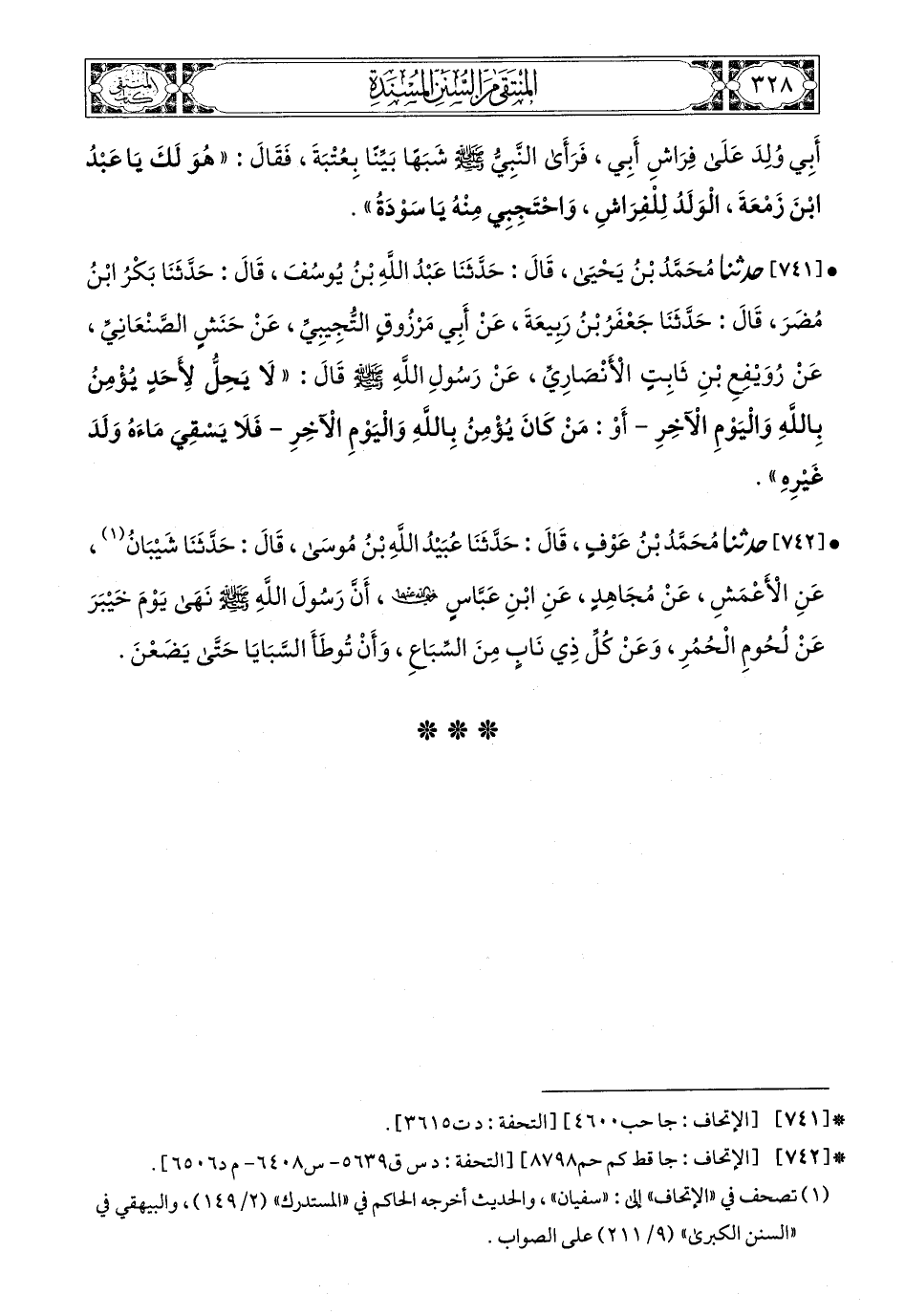 741- حَدَّثَنَا مُحَمَّدُ بْنُ يَحْيَى، قَالَ: حَدَّثَنَا عَبْدُ اللهِ بْنُ يُوسُفَ، قَالَ: حَدَّثَنَا بَكْرُ بْنُ مُضَرَ، قَالَ: حَدَّثَنَا جَعْفَرُ بْنُ رَبِيعَةَ، عَنْ أَبِي مَرْزُوقٍ التُّجِيبِيِّ، عَنْ حَنَشٍ الصَّنْعَانِيِّ، عَنْ رُوَيْفِعِ بْنِ ثَابِتٍ الأَنْصَارِيِّ، عَنْ رَسُولِ اللهِ صَلى الله عَليه وسَلم قَالَ: لاَ يَحِلُّ لأَحَدٍ يُؤْمِنُ بِاللَّهِ وَالْيَوْمِ الآخِرِ، أَوْ مَنْ كَانَ يُؤْمِنُ بِاللَّهِ وَالْيَوْمِ الآخِرِ فَلاَ يَسْقِ مَاءَهُ وَلَدَ غَيْرِهِ.