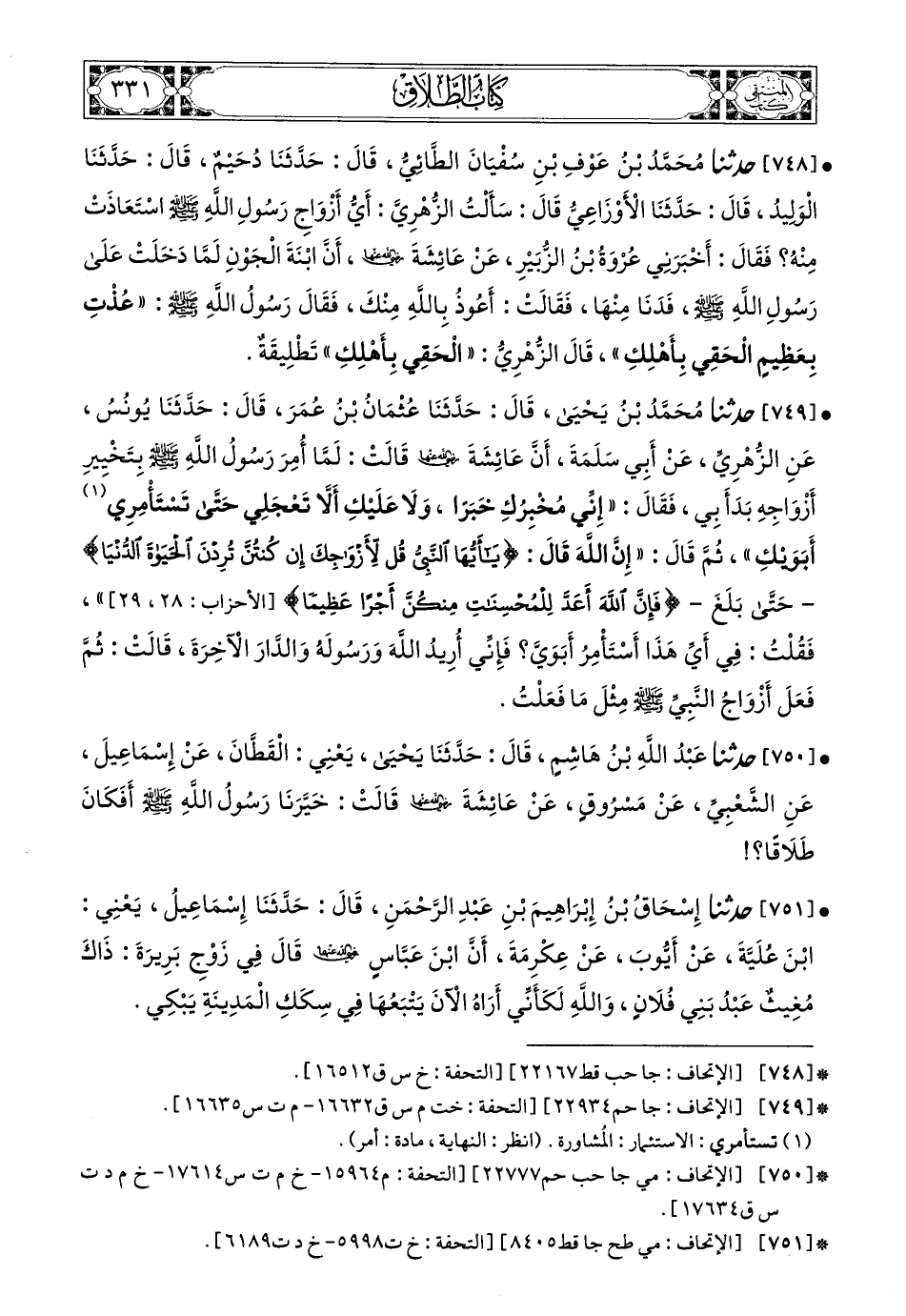 749 - حَدَّثَنَا مُحَمَّدُ بْنُ يَحْيَى، قَالَ: حَدَّثَنَا عُثْمَانُ بْنُ عُمَرَ، قَالَ: حَدَّثَنَا يُونُسُ، عَنِ الزُّهْرِيِّ، عَنْ أَبِي سَلَمَةَ، أَنَّ عَائِشَةَ، رَضِيَ اللهُ عَنْهَا، قَالَتْ: لَمَّا أُمِرَ رَسُولُ اللهِ صَلى الله عَليه وسَلم بِتَخْيِيرِ أَزْوَاجِهِ بَدَأَ بِي، فَقَالَ: إِنِّي مُخْبِرُكِ خَبَرًا وَلاَ عَلَيْكِ أَنْ لاَ تَعْجَلِي حَتَّى تَسْتَأْمِرِي أَبَوَيْكِ، ثُمَّ قَالَ: إِنَّ اللَّهَ قَالَ {يَا أَيُّهَا النَّبِيُّ قُلْ لأَزْوَاجِكَ إِنْ كُنْتُنَّ تُرِدْنَ الْحَيَاةَ الدُّنْيَا} حَتَّى بَلَغَ {فَإِنَّ اللَّهَ أَعَدَّ لِلْمُحْسِنَاتِ مِنْكُنَّ أَجْرًا عَظِيمًا} [الأحزاب 28، 29]، فَقُلْتُ: فِي أَيِّ هَذَا أَسْتَأْمِرُ أَبَوَيَّ؟ فَإِنِّي أُرِيدُ اللَّهَ وَرَسُولَهُ وَالدَّارَ الآخِرَةَ، قَالَتْ: ثُمَّ فَعَلَ أَزْوَاجُ النَّبِيِّ صَلى الله عَليه وسَلم مِثْلَ مَا فَعَلْتُ.