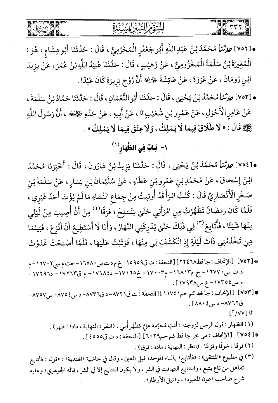 754 - حَدَّثَنَا مُحَمَّدُ بْنُ يَحْيَى، قَالَ: حَدَّثَنَا يَزِيدُ بْنُ هَارُونَ، قَالَ: أَخْبَرَنَا مُحَمَّدُ بْنُ إِسْحَاقَ، عَنْ مُحَمَّدِ بْنِ عَمْرِو بْنِ عَطَاءٍ، عَنْ سُلَيْمَانَ بْنِ يَسَارٍ، عَنْ سَلَمَةَ بْنِ صَخْرٍ الأَنْصَارِيِّ، قَالَ: كُنْتُ امْرَءًا قَدْ أُوتِيتُ مِنْ جِمَاعِ النِّسَاءِ مَا لَمْ يُؤْتَ أَحَدٌ غَيْرِي، فَلَمَّا كَانَ رَمَضَانُ تَظَهَّرْتُ مِنِ امْرَأَتِي حَتَّى يَنْسَلِخَ فَرَقًا مِنْ أَنْ أُصِيبَ مِنْ لَيْلِي مِنْهَا شَيْئًا، فَأُتَايِعَ فِي ذَلِكَ حَتَّى يُدْرِكَنِي النَّهَارُ، وَأَنَا لاَ أَسْتَطِيعُ أَنْ أَنْزِعَ، فَبَيْنَمَا هِيَ تَخْدُمُنِي ذَاتَ لَيْلَةٍ إِذِ انْكَشَفَ لِي مِنْهَا، فَوَثَبْتُ عَلَيْهَا فَلَمَّا أَصْبَحْتُ غَدَوْتُ عَلَى قَوْمِي فَأَخْبَرْتُهُمْ خَبَرِي، فَقُلْتُ لَهُمُ: انْطَلِقُوا إِلَى رَسُولِ اللهِ صَلى الله عَليه وسَلم فَأَخْبِرُوهُ بِأَمْرِي، فَقَالُوا: لاَ وَاللَّهِ لاَ نَفْعَلُ نَتَخَوَّفُ أَنْ يَنْزِلَ فِينَا قُرْآنٌ، أَوْ يَقُولَ فِينَا رَسُولُ اللهِ صَلى الله عَليه وسَلم مَقَالَةً يَبْقَى عَلَيْنَا عَارُهَا، وَلَكِنِ اذْهَبْ فَاصْنَعْ مَا بَدَا لَكَ،