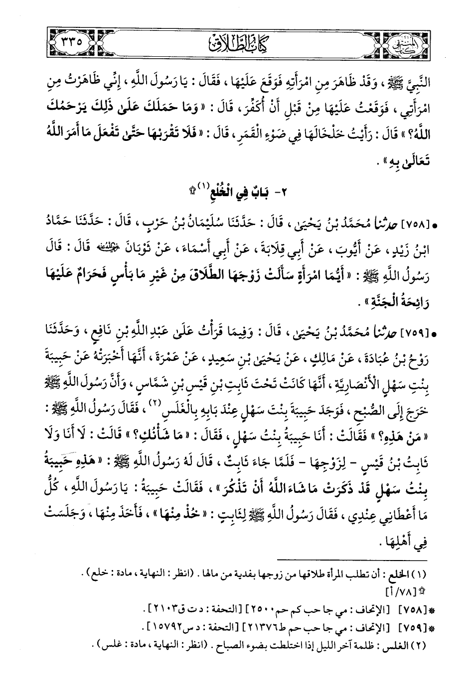 759 - حَدَّثَنَا مُحَمَّدُ بْنُ يَحْيَى، قَالَ: وَفِيمَا قَرَأْتُ عَلَى عَبْدِ اللهِ بْنِ نَافِعٍ، وَحَدَّثَنَا رَوْحُ بْنُ عُبَادَةَ، عَنْ مَالِكٍ، عَنْ يَحْيَى بْنِ سَعِيدٍ، عَنْ عَمْرَةَ، أَنَّهَا أَخْبَرَتْهُ، عَنْ حَبِيبَةَ بِنْتِ سَهْلٍ الأَنْصَارِيَّةِ، أَنَّهَا كَانَتْ تَحْتَ ثَابِتِ بْنِ قَيْسِ بْنِ شَمَّاسٍ، وَأَنَّ رَسُولَ اللهِ صَلى الله عَليه وسَلم خَرَجَ إِلَى الصُّبْحِ، فَوَجَدَ حَبِيبَةَ بِنْتَ سَهْلٍ عِنْدَ بَابِهِ بِالْغَلَسِ، فَقَالَ رَسُولُ اللهِ صَلى الله عَليه وسَلم: مَنْ هَذِهِ؟ فَقَالَتْ: أَنَا حَبِيبَةُ بِنْتُ سَهْلٍ، فَقَالَ: مَا شَأْنُكِ؟ قَالَتْ: لاَ أَنَا وَلاَ ثَابِتُ بْنُ قَيْسٍ لِزَوْجِهَا، فَلَمَّا جَاءَ ثَابِتٌ، قَالَ لَهُ رَسُولُ اللهِ صَلى الله عَليه وسَلم: هَذِهِ حَبِيبَةُ بِنْتُ سَهْلٍ قَدْ ذَكَرَتْ مَا شَاءَ اللهُ أَنْ تَذْكُرَ، فَقَالَتْ حَبِيبَةُ: يَا رَسُولَ اللهِ كُلَّ مَا أَعْطَانِي عِنْدِي، فَقَالَ رَسُولُ اللهِ صَلى الله عَليه وسَلم لِثَابِتٍ: خُذْ مِنْهَا، فَأَخَذَ مِنْهَا، وَجَلَسَتْ فِي أَهْلِهَا.