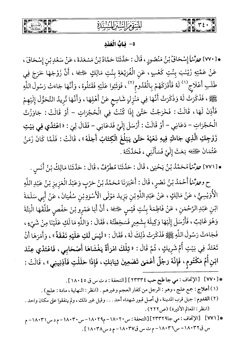 770 - حَدَّثَنَا إِسْحَاقُ بْنُ مَنْصُورٍ، قَالَ: حَدَّثَنَا حَمَّادُ بْنُ مَسْعَدَةَ، عَنْ سَعْدِ بْنِ إِسْحَاقَ، عَنْ عَمَّتِهِ زَيْنَبَ بِنْتِ كَعْبٍ، عَنِ الْفُرَيْعَةِ بِنْتِ مَالِكٍ، رَضِيَ اللهُ عَنْهَا، أَنَّ زَوْجَهَا خَرَجَ فِي طَلَبِ أَعْلاَجٍ لَهُ فَأَدْرَكَهُمْ بِالْقَدُومِ، فَوَثَبُوا عَلَيْهِ فَقَتَلُوهُ، وَأَنَّهَا جَاءَتْ رَسُولَ اللهِ صَلى الله عَليه وسَلم، فَذَكَرَتْ لَهُ وَذَكَرَتْ أَنَّهَا فِي مَنْزِلٍ شَاسِعٍ عَنْ أَهْلِهَا وَأَنَّهَا تُرِيدُ التَّحَوُّلَ إِلَيْهِمْ فَأَذِنَ لَهَا، قَالَتْ: فَخَرَجْتُ حَتَّى إِذَا كُنْتُ فِي الْحُجُرَاتِ، أَوْ قَالَتْ: جَاوَزْتُ الْحُجُرَاتِ دَعَانِي أَوْ قَالَتْ: أَرْسَلَ إِلَيَّ فَدَعَانِي فَقَالَ لِي: اعْتَدِّي فِي بَيْتِ زَوْجِكِ الَّذِي جَاءَكِ فِيهِ نَعْيُهُ حَتَّى يَبْلُغَ الْكِتَابُ أَجَلَهُ، قَالَتْ فَلَمَّا كَانَ زَمَنُ عُثْمَانَ، رَضِيَ اللهُ عَنْهُ، بَعَثَ إِلَيَّ فَسَأَلَنِي، فَحَدَّثْتُهُ.