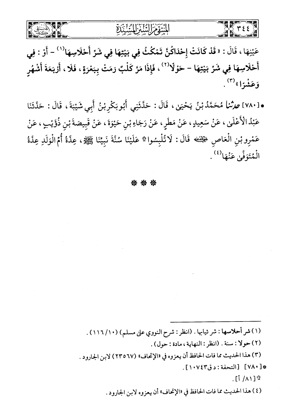 780 - حَدَّثَنَا مُحَمَّدُ بْنُ يَحْيَى، قَالَ: حَدَّثَنِي أَبُو بَكْرِ بْنُ أَبِي شَيْبَةَ، قَالَ: حَدَّثَنَا عَبْدُ الأَعْلَى، عَنْ سَعِيدٍ، عَنْ مَطَرٍ، عَنْ رَجَاءِ بْنِ حَيْوَةَ، عَنْ قَبِيصَةَ بْنِ ذُؤَيْبٍ، عَنْ عَمْرِو بْنِ الْعَاصِ، رَضِيَ اللهُ عَنْهُ، قَالَ: لاَ تُلْبِسُوا عَلَيْنَا سُنَّةَ نَبِيِّنَا صَلى الله عَليه وسَلم، عِدَّةُ أُمِّ الْوَلَدِ عِدَّةُ الْمُتَوَفَّى عَنْهَا.