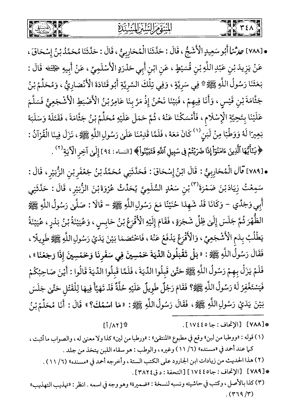 788 - حَدَّثَنَا أَبُو سَعِيدٍ الأَشَجُّ، قَالَ: حَدَّثَنَا الْمُحَارِبِيُّ، قَالَ: حَدَّثَنَا مُحَمَّدُ بْنُ إِسْحَاقَ، عَنْ يَزِيدَ بْنِ عَبْدِ اللهِ بْنِ قُسَيْطٍ، عَنِ ابْنِ أَبِي حَدْرَدٍ الأَسْلَمِيِّ، عَنْ أَبِيهِ، رَضِيَ اللهُ عَنْهُ، قَالَ: بَعَثَنَا رَسُولُ اللهِ صَلى الله عَليه وسَلم فِي سَرِيَّةٍ، وَفِي تِلْكَ السَّرِيَّةِ أَبُو قَتَادَةَ الأَنْصَارِيُّ، وَمُحَلِّمُ بْنُ جَثَّامَةَ بْنِ قَيْسٍ، وَأَنَا فِيهِمْ فَبَيْنَا نَحْنُ إِذْ مَرَّ بِنَا عَامِرُ بْنُ الأَضْبَطِ الأَشْجَعِيُّ فَسَلَّمَ عَلَيْنَا بِتَحِيَّةِ الإِسْلاَمِ، فَأَمْسَكْنَا عَنْهُ، ثُمَّ حَمَلَ عَلَيْهِ مُحَلِّمُ بْنُ جَثَّامَةَ فَقَتَلَهُ وَسَلَبُهُ بَعِيرًا لَهُ وَوَطْبًا مِنْ لَبَنٍ كَانَ مَعَهُ، فَلَمَّا قَدِمْنَا عَلَى رَسُولِ اللهِ صَلى الله عَليه وسَلم نَزَلَ فِينَا الْقُرْآنُ {يَا أَيُّهَا الَّذِينَ آمَنُوا إِذَا ضَرَبْتُمْ فِي سَبِيلِ اللهِ فَتَبَيَّنُوا} [النساء 94] إِلَى آخِرِ الآيَةِ.