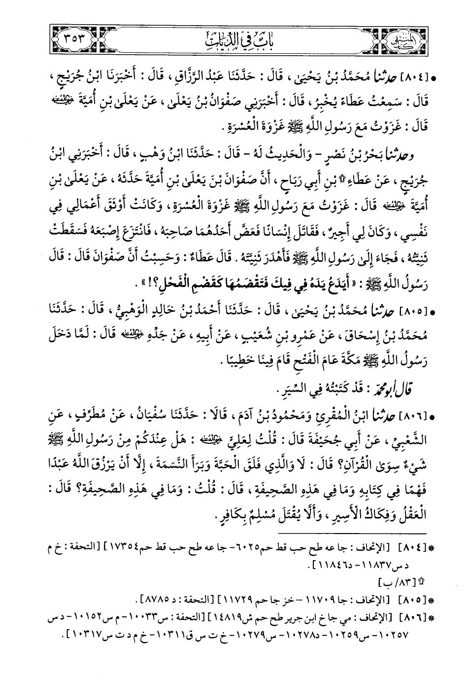 804 - حَدَّثَنَا مُحَمَّدُ بْنُ يَحْيَى، قَالَ: حَدَّثَنَا عَبْدُ الرَّزَّاقِ، قَالَ: أَخْبَرَنَا ابْنُ جُرَيْجٍ، قَالَ: سَمِعْتُ عَطَاءً، يُخْبِرُ قَالَ: أَخْبَرَنِي صَفْوَانُ بْنُ يَعْلَى، عَنْ يَعْلَى بْنِ أُمَيَّةَ، رَضِيَ اللهُ عَنْهُ، قَالَ: غَزَوْتُ مَعَ رَسُولِ اللهِ صَلى الله عَليه وسَلم غَزْوَةَ الْعُسْرَةِ، وَحَدَّثَنَا بَحْرُ بْنُ نَصْرٍ، وَالْحَدِيثُ لَهُ، قَالَ: حَدَّثَنَا ابْنُ وَهْبٍ، قَالَ، أَخْبَرَنِي ابْنُ جُرَيْجٍ، عَنْ عَطَاءِ بْنِ أَبِي رَبَاحٍ، أَنَّ صَفْوَانَ بْنَ يَعْلَى بْنِ أُمَيَّةَ حَدَّثَهُ، عَنْ يَعْلَى بْنِ أُمَيَّةَ، رَضِيَ اللهُ عَنْهُ، قَالَ: غَزَوْتُ مَعَ رَسُولِ اللهِ صَلى الله عَليه وسَلم غَزْوَةَ الْعُسْرَةِ، وَكَانَتْ أَوْثَقَ أَعْمَالِي فِي نَفْسِي، وَكَانَ لِي أَجِيرٌ، فَقَاتَلَ إِنْسَانًا فَعَضَّ أَحَدُهُمَا صَاحِبَهُ فَانْتَزَعَ إِصْبَعَهُ فَسَقَطَتْ ثَنِيتُهُ، فَجَاءَ إِلَى رَسُولِ اللهِ صَلى الله عَليه وسَلم فَأَهْدَرَ ثَنِيتَهُ، قَالَ عَطَاءٌ: وَحَسَبْتُ أَنَّ صَفْوَانَ قَالَ: قَالَ رَسُولُ اللهِ صَلى الله عَليه وسَلم: أَيَدَعُ يَدَهُ فِي فِيكَ فَتَقْضِمُهَا كَقَضْمِ الْفَحْلِ.