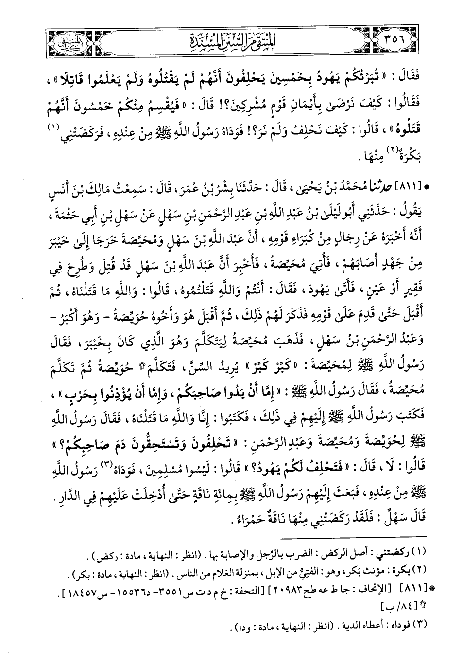 811 - حَدَّثَنَا مُحَمَّدُ بْنُ يَحْيَى، قَالَ: حَدَّثَنَا بِشْرُ بْنُ عُمَرَ، قَالَ: سَمِعْتُ مَالِكَ بْنَ أَنَسٍ، يَقُولُ: حَدَّثَنِي أَبُو لَيْلَى بْنُ عَبْدِ اللهِ بْنِ عَبْدِ الرَّحْمَنِ بْنِ سَهْلٍ، عَنْ سَهْلِ بْنِ أَبِي حَثْمَةَ، أَنَّهُ أَخْبَرَهُ، عَنْ رِجَالٍ مِنْ كُبَرَاءِ قَوْمِهِ، أَنَّ عَبْدَ اللهِ بْنَ سَهْلٍ، وَمُحَيِّصَةَ خَرَجَا إِلَى خَيْبَرَ مِنْ جَهْدٍ أَصَابَهُمْ، فَأُتِيَ مُحَيِّصَةُ فَأُخْبِرَ أَنَّ عَبْدَ اللهِ بْنَ سَهْلٍ قَدْ قُتِلَ وَطُرِحَ فِي فَقِيرٍ أَوْ عَيْنٍ، فَأَتَى يَهُودَ فَقَالَ: أَنْتُمْ وَاللَّهِ قَتَلْتُمُوهُ، قَالُوا: وَاللَّهِ مَا قَتَلْنَاهُ، ثُمَّ أَقْبَلَ حَتَّى قَدِمَ عَلَى قَوْمِهِ فَذَكَرَ لَهُمْ ذَلِكَ، ثُمَّ أَقْبَلَ هُوَ وَأَخُوهُ حُوَيِّصَةُ وَهُوَ أَكْبَرُ وَعَبْدُ الرَّحْمَنِ بْنُ سَهْلٍ فَذَهَبَ مُحَيِّصَةُ لَيَتَكَلَّمَ وَهُوَ الَّذِي كَانَ بِخَيْبَرَ، فَقَالَ رَسُولُ اللهِ صَلى الله عَليه وسَلم لِمُحَيِّصَةَ: كَبِّرْ كَبِّرْ، يُرِيدُ السِّنَّ فَتَكَلَّمَ حُوَيِّصَةُ، ثُمَّ تَكَلَّمَ مُحَيِّصَةُ، فَقَالَ رَسُولُ اللهِ صَلى الله عَليه وسَلم: إِمَّا أَنْ يَدُوا صَاحِبَكُمْ، وَإِمَّا أَنْ يُؤْذِنُوا بِحَرْبٍ، فَكَتَبَ رَسُولُ اللهِ صَلى الله عَليه وسَلم إِلَيْهِمْ فِي ذَلِكَ، فَكَتَبُوا: إِنَّا وَاللَّهِ مَا قَتَلْنَاهُ، فَقَالَ رَسُولُ اللهِ صَلى الله عَليه وسَلم لِحُوَيِّصَةَ، وَمُحَيِّصَةَ، وَعَبْدِ الرَّحْمَنِ: تَحْلِفُونَ وَتَسْتَحِقُّونَ دَمَ صَاحِبِكُمْ؟ قَالُوا: لاَ، قَالَ: فَتَحْلِفُ لَكُمْ يَهُودُ؟ قَالُوا: لَيْسُوا مُسْلِمَيْنِ، فَوَدَاهُ رَسُولُ اللهِ صَلى الله عَليه وسَلم مِنْ عِنْدِهِ، فَبَعَثَ إِلَيْهِمْ رَسُولُ اللهِ صَلى الله عَليه وسَلم بِمِئَةِ نَاقَةٍ حَتَّى أُدْخِلَتْ عَلَيْهِمْ فِي الدَّارِ قَالَ سَهْلٌ: فَلَقَدْ رَكَضَتْنِي مِنْهَا نَاقَةٌ حَمْرَاءُ.