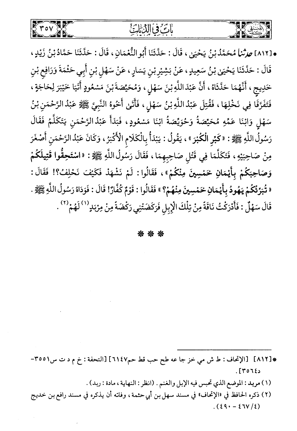 812 - حَدَّثَنَا مُحَمَّدُ بْنُ يَحْيَى، قَالَ: حَدَّثَنَا أَبُو النُّعْمَانِ، قَالَ: حَدَّثَنَا حَمَّادُ بْنُ زَيْدٍ، قَالَ: حَدَّثَنَا يَحْيَى بْنُ سَعِيدٍ، عَنْ بَشِيرِ بْنِ يَسَارٍ، عَنْ سَهْلِ بْنِ أَبِي حَثْمَةَ، وَرَافِعِ بْنِ خَدِيجٍ، أَنَّهُمَا حَدَّثَاهُ أَنَّ عَبْدَ اللهِ بْنَ سَهْلٍ، وَمُحَيِّصَةَ بْنَ مَسْعُودٍ، أَتَيَا خَيْبَرَ لِحَاجَةٍ، فَتَفَرَّقَا فِي نَخْلِهَا فَقُتِلَ عَبْدُ اللهِ بْنُ سَهْلٍ، فَأَتَى أَخُوهُ النَّبِيَّ صَلى الله عَليه وسَلم عَبْدُ الرَّحْمَنِ بْنُ سَهْلٍ، وَابْنَا عَمِّهِ مُحَيِّصَةُ وَحُوَيِّصَةُ ابْنَا مَسْعُودٍ فَبَدَأَ عَبْدُ الرَّحْمَنِ يَتَكَلَّمُ، فَقَالَ رَسُولُ اللهِ: كَبِّرِ الْكُبْرَ، يَقُولُ: يَبْدَأُ بِالْكَلاَمِ الأَكْبَرُ، وَكَانَ عَبْدُ الرَّحْمَنِ أَصْغَرَ مِنْ صَاحِبَيْهِ، فَتَكَلَّمَا فِي قَتْلِ صَاحِبِهِمَا، فَقَالَ رَسُولُ اللهِ صَلى الله عَليه وسَلم: اسْتَحِقُّوا قَتِيلَكُمْ وَصَاحِبَكُمْ بِأَيْمَانِ خَمْسِينَ مِنْكُمْ، فَقَالُوا: لَمْ نَشْهَدْ فَكَيْفَ نَحْلِفُ؟ فَقَالَ: تُبَرِّئُكُمْ يَهُودُ بِأَيْمَانِ خَمْسِينَ مِنْهُمْ، فَقَالُوا: قَوْمٌ كُفَّارٌ قَالَ: فَوَادَهُ رَسُولُ اللهِ صَلى الله عَليه وسَلم قَالَ سَهْلٌ: فَأَدْرَكْتُ نَاقَةً مِنَ الإِبِلِ رَكَضَتْنِي رَكْضَةً مِنْ مِرْبَدٍ لَهُمْ.