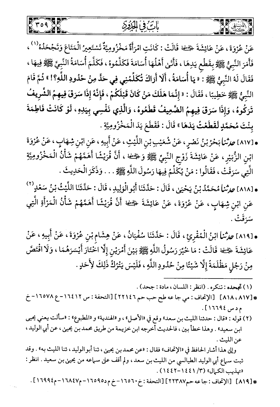 817 - حَدَّثَنَا بَحْرُ بْنُ نَصْرٍ، عَنْ شُعَيْبِ بْنِ اللَّيْثِ، عَنْ أَبِيهِ، عَنِ ابْنِ شِهَابٍ، عَنْ عُرْوَةَ بْنِ الزُّبَيْرِ، عَنْ عَائِشَةَ، رَضِيَ اللهُ عَنْهَا، أَنَّ قُرَيْشًا، أَهَمَّهُمْ شَأْنُ الْمَخْزُومِيَّةِ الَّتِي سَرَقَتْ فَقَالُوا: مَنْ يُكَلِّمُ فِيهَا رَسُولَ اللهِ صَلى الله عَليه وسَلم وَذَكَرَ الْحَدِيثَ.