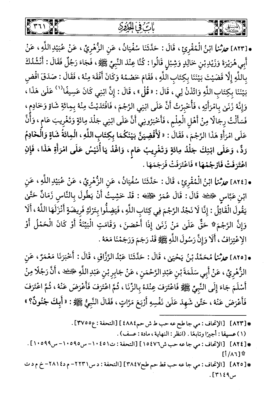 823 - حَدَّثَنَا ابْنُ الْمُقْرِئِ، قَالَ: حَدَّثَنَا سُفْيَانُ، عَنِ الزُّهْرِيِّ، عَنْ عُبَيْدِ اللهِ، عَنْ أَبِي هُرَيْرَةَ، وَزَيْدِ بْنِ خَالِدٍ، وَشِبْلٍ، قَالُوا: كُنَّا عِنْدَ النَّبِيِّ صَلى الله عَليه وسَلم فَجَاءَ رَجُلٌ فَقَالَ: أَنْشُدُكَ بِاللَّهِ إِلاَّ قَضَيْتَ بَيْنَنَا بِكِتَابِ اللهِ، فَقَامَ خَصْمُهُ وَكَانَ أَفْقَهَ مِنْهُ فَقَالَ: صَدَقَ اقْضِ بَيْنَنَا بِكِتَابِ اللهِ وَائْذَنْ لِي، قَالَ: قُلْ، قَالَ: إِنَّ ابْنِي كَانَ عَسِيفًا عَلَى هَذَا، وَإِنَّهُ زَنَى بِامْرَأَتِهِ فَأُخْبِرْتُ أَنَّ عَلَى ابْنِي الرَّجْمَ فَافْتَدَيْتُ مِنْهُ مِئَةَ شَاةٍ وَخَادِمٍ، فَسَأَلْتُ رِجَالاً مِنْ أَهْلِ الْعِلْمِ فَأَخْبَرُونِي أَنَّ عَلَى ابْنِي جَلْدَ مِئَةٍ وَتَغْرِيبَ عَامٍ، وَأَنَّ عَلَى امْرَأَةِ هَذَا الرَّجْمَ، فَقَالَ: لأَقْضِيَنَّ بَيْنَكُمَا بِكِتَابِ اللهِ، الْمِئَةُ شَاةٍ وَالْخَادِمُ رَدٌّ، وَعَلَى ابْنِكَ جَلْدُ مِئَةٍ وَتَغْرِيبُ عَامٍ، وَاغْدُ يَا أُنَيْسُ عَلَى امْرَأَةِ هَذَا فَإِنِ اعْتَرَفَتْ فَارْجُمْهَا، فَاعْتَرَفَتْ فَرَجَمَهَا.