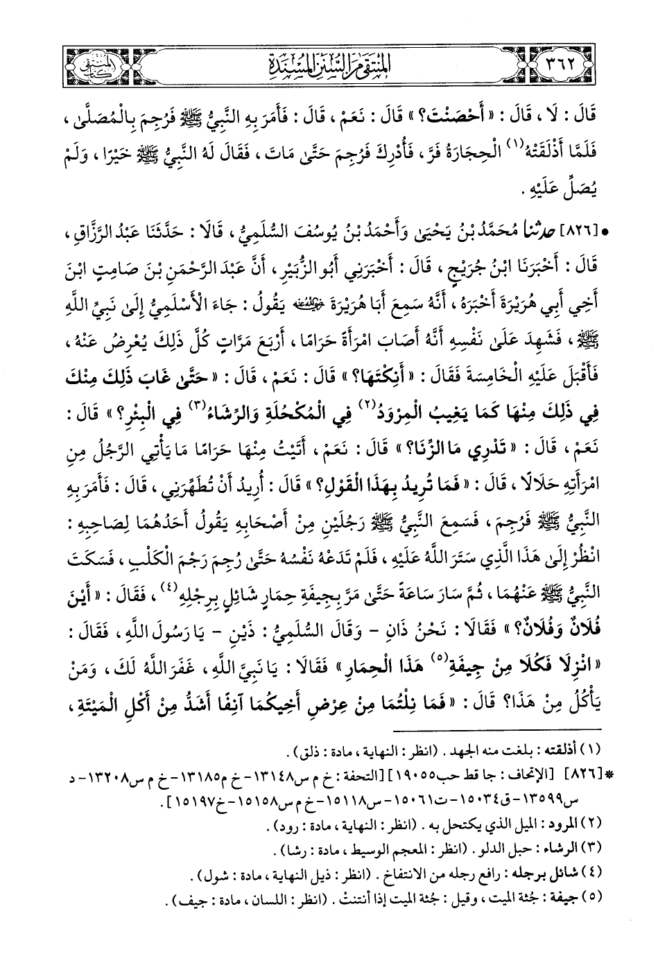 826 - حَدَّثَنَا مُحَمَّدُ بْنُ يَحْيَى، وَأَحْمَدُ بْنُ يُوسُفَ السُّلَمِيُّ، قَالاَ: حَدَّثَنَا عَبْدُ الرَّزَّاقِ، قَالَ: أَخْبَرَنَا ابْنُ جُرَيْجٍ، قَالَ: أَخْبَرَنِي أَبُو الزُّبَيْرِ، أَنَّ عَبْدَ الرَّحْمَنِ بْنَ صَامِتِ ابْنِ أَخِي أَبِي هُرَيْرَةَ، أَخْبَرَهُ أَنَّهُ، سَمِعَ أَبَا هُرَيْرَةَ، رَضِيَ اللهُ عَنْهُ، يَقُولُ: جَاءَ الأَسْلَمِيُّ إِلَى نَبِيِّ اللهِ صَلى الله عَليه وسَلم فَشَهِدَ عَلَى نَفْسِهِ أَنَّهُ أَصَابَ امْرَأَةً حَرَامًا أَرْبَعَ مَرَّاتٍ، كُلَّ ذَلِكَ يُعْرِضُ عَنْهُ، فَأَقْبَلَ عَلَيْهِ الْخَامِسَةَ فَقَالَ: أَنِكْتَهَا؟ قَالَ: نَعَمْ قَالَ: حَتَّى غَابَ ذَلِكَ مِنْكَ فِي ذَلِكَ مِنْهَا كَمَا يَغِيبُ الْمِرْوَدُ فِي الْمُكْحُلَةِ وَالرِّشَاءُ فِي الْبِئْرِ؟ قَالَ: نَعَمْ قَالَ: تَدْرِي مَا الزِّنَا؟ قَالَ: نَعَمْ أَتَيْتُ مِنْهَا حَرَامًا مَا يَأْتِي الرَّجُلُ مِنِ امْرَأَتِهِ حَلاَلاً، قَالَ: فَمَا تُرِيدُ بِهَذَا الْقَوْلِ؟ قَالَ: أُرِيدُ أَنْ تُطَهِّرَنِي، قَالَ: فَأَمَرَ بِهِ النَّبِيُّ صَلى الله عَليه وسَلم فَرُجِمَ، فَسَمِعَ النَّبِيُّ صَلى الله عَليه وسَلم رَجُلَيْنِ مِنْ أَصْحَابِهِ يَقُولُ أَحَدُهُمَا لِصَاحِبِهِ: انْظُرْ إِلَى هَذَا الَّذِي سَتَرَ اللهُ عَلَيْهِ فَلَمْ تَدَعْهُ نَفْسُهُ حَتَّى رُجِمَ رَجْمَ الْكَلْبِ، فَسَكَتَ النَّبِيُّ صَلى الله عَليه وسَلم عَنْهُمَا، ثُمَّ سَارَ سَاعَةً حَتَّى مَرَّ بِجِيفَةِ حِمَارٍ شَائِلٍ بِرِجْلِهِ، فَقَالَ: أَيْنَ فُلاَنٌ وَفُلاَنٌ؟ فَقَالاَ: نَحْنُ ذَانِ، وَقَالَ السُّلَمِيُّ: ذَيْنِ يَا رَسُولَ اللهِ فَقَالَ: انْزِلاَ فَكُلاَ مِنْ جِيفَةِ هَذَا الْحِمَارِ، فَقَالاَ: يَا نَبِيَّ اللهِ غَفَرَ اللهُ لَكَ وَمَنْ يَأْكُلُ مِنْ هَذَا؟ قَالَ: فَمَا نِلْتُمَا مِنْ عِرْضِ أَخِيكُمَا آنِفًا أَشَدُّ مِنْ أَكَلِ الْمَيْتَةِ، وَالَّذِي نَفْسِي بِيَدِهِ إِنَّهُ للآنَ لَفِي أَنْهَارِ الْجَنَّةِ يَنْغَمِسُ فِيهَا، وَقَالَ السُّلَمِيُّ: يَنْقَمِصُ فِيهَا.