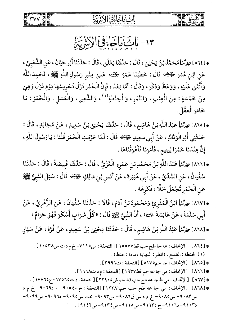 867 - حَدَّثَنَا ابْنُ الْمُقْرِئِ، وَمَحْمُودُ بْنُ آدَمَ، قَالَ: حَدَّثَنَا سُفْيَانُ، عَنِ الزُّهْرِيِّ، عَنْ أَبِي سَلَمَةَ، عَنْ عَائِشَةَ، رَضِيَ اللهُ عَنْهَا، أَنَّ النَّبِيَّ صَلى الله عَليه وسَلم قَالَ: كُلُّ شَرَابٍ أَسْكَرَ فَهُوَ حَرَامٌ.