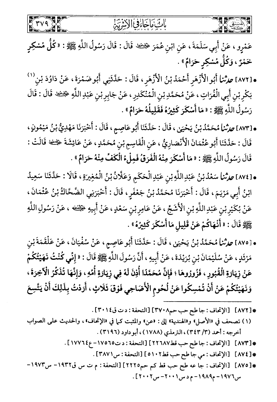 874 - حَدَّثَنَا سَعْدُ بْنُ عَبْدِ اللهِ بْنِ عَبْدِ الْحَكَمِ، وَعَلاَّنُ بْنُ الْمُغِيرَةِ، قَالاَ: حَدَّثَنَا سَعِيدُ بْنُ أَبِي مَرْيَمَ، قَالَ: أَخْبَرَنَا مُحَمَّدُ بْنُ جَعْفَرٍ، قَالَ: أَخْبَرَنِي الضَّحَّاكُ بْنُ عُثْمَانَ، عَنْ بُكَيْرِ بْنِ عَبْدِ اللهِ بْنِ الأَشَجِّ، عَنْ عَامِرِ بْنِ سَعْدٍ، عَنْ أَبِيهِ، رَضِيَ اللهُ عَنْهُ، عَنْ رَسُولِ اللهِ صَلى الله عَليه وسَلم قَالَ: أَنْهَاكُمْ عَنْ قَلِيلِ مَا أَسْكَرَ كَثِيرُهُ.