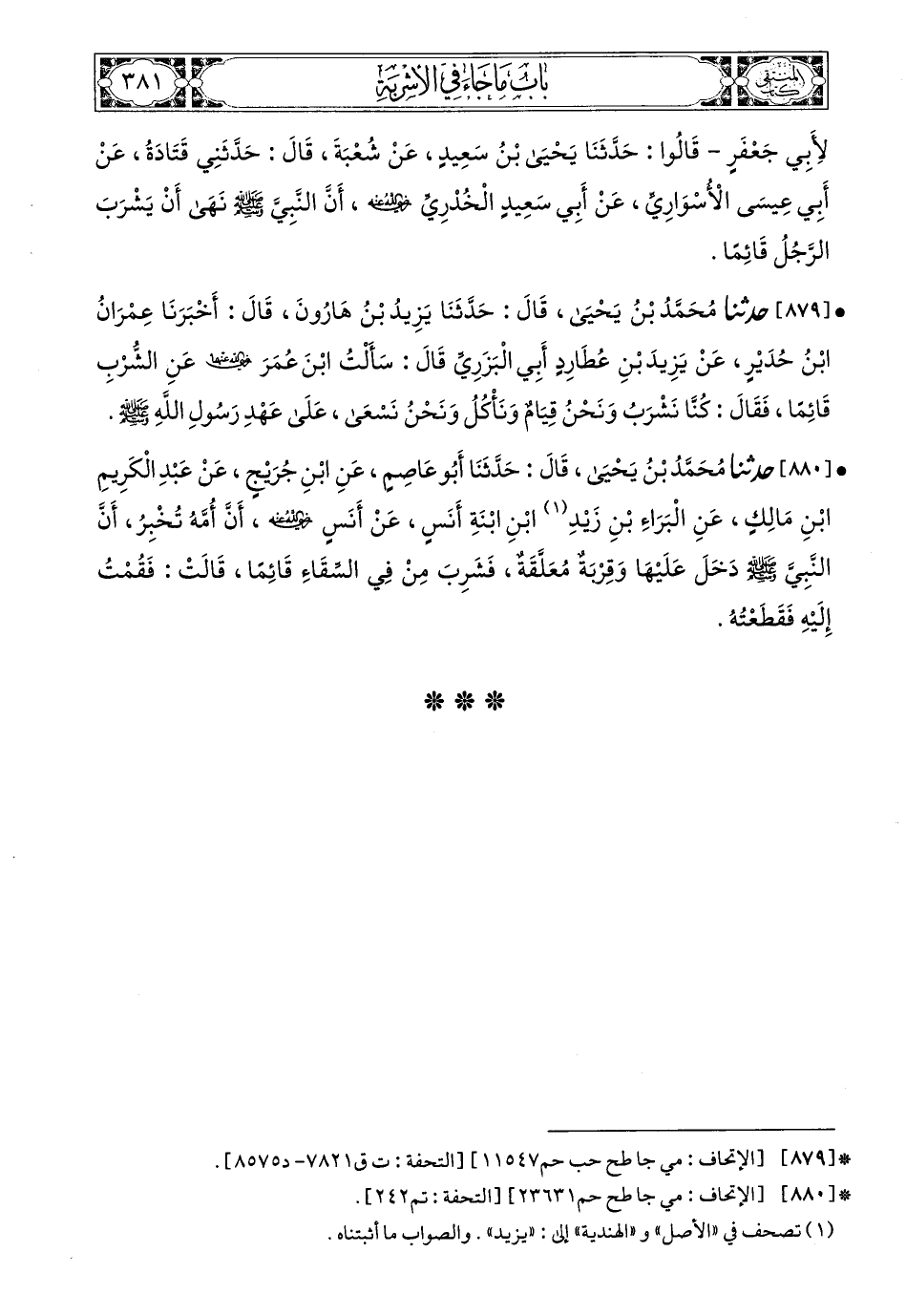 879 - حَدَّثَنَا مُحَمَّدُ بْنُ يَحْيَى، قَالَ: حَدَّثَنَا يَزِيدُ بْنُ هَارُونَ، قَالَ: أَخْبَرَنَا عِمْرَانُ ابْنُ حُدَيْرٍ، عَنْ يَزِيدَ بْنِ عُطَارِدٍ أَبِي الْبَزَرِيِّ، قَالَ: سَأَلْتُ ابْنَ عُمَرَ، رَضِيَ اللهُ عَنْهُمَا عَنِ الشُّرْبِ قَائِمًا، فَقَالَ: كُنَّا نَشْرَبُ وَنَحْنُ قِيَامٌ، وَنَأْكُلُ وَنَحْنُ نَسْعَى عَلَى عَهْدِ رَسُولِ اللهِ صَلى الله عَليه وسَلم.