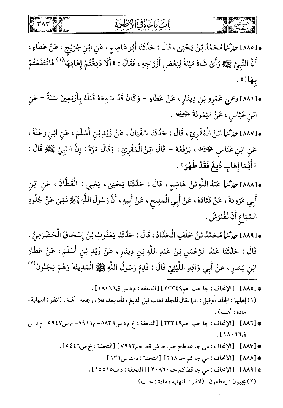 885- حَدَّثَنَا مُحَمَّدُ بْنُ يَحْيَى، قَالَ: حَدَّثَنَا أَبُو عَاصِمٍ، عَنِ ابْنِ جُرَيْجٍ، عَنْ عَطَاءٍ، أَنَّ النَّبِيَّ صَلى الله عَليه وسَلم رَأَى شَاةً مَيْتَةً لِبَعْضِ أَزْوَاجِهِ، فَقَالَ: أَلاَ دَبَغْتُمْ إِهَابَهَا فَانْتَفَعْتُمْ بِهَا.