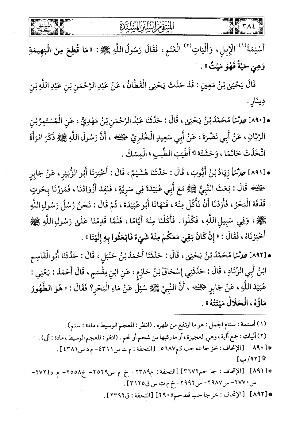 892- حَدَّثَنَا مُحَمَّدُ بْنُ يَحْيَى، قَالَ: حَدَّثَنَا أَحْمَدُ بْنُ حَنْبَلٍ، قَالَ: حَدَّثَنَا أَبُو الْقَاسِمِ بْنُ أَبِي الزِّنَادِ، قَالَ: حَدَّثَنِي إِسْحَاقُ بْنُ حَازِمٍ، عَنِ ابْنِ مِقْسَمٍ، قَالَ أَحْمَدُ يَعْنِي عُبَيْدَ اللهِ، عَنْ جَابِرٍ، رَضِيَ اللهُ عَنْهُ، أَنَّ النَّبِيَّ صَلى الله عَليه وسَلم سُئِلَ عَنْ مَاءِ الْبَحْرِ فَقَالَ: هُوَ الطَّهُورُ مَاؤُهُ الْحَلاَلُ مَيْتَتُهُ.