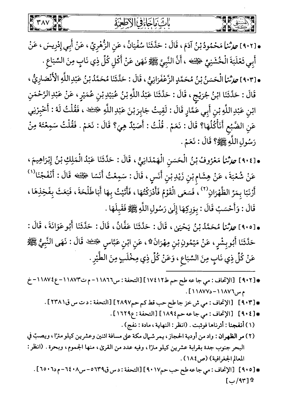 902- حَدَّثَنَا مَحْمُودُ بْنُ آدَمَ، قَالَ: حَدَّثَنَا سُفْيَانُ، عَنِ الزُّهْرِيِّ، عَنْ أَبِي إِدْرِيسَ، عَنْ أَبِي ثَعْلَبَةَ الخَشْنِيِّ، رَضِيَ اللهُ عَنْهُ، أَنَّ النَّبِيَّ صَلى الله عَليه وسَلم نَهَى عَنْ أَكْلِ كُلِّ ذِي نَابٍ مِنَ السِّبَاعِ.