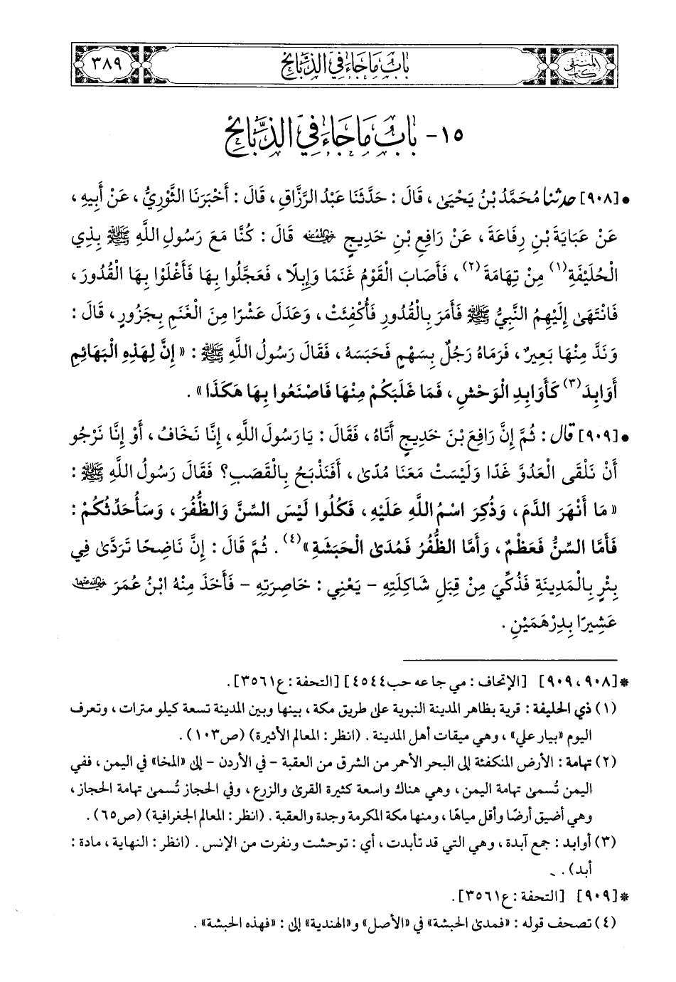 908 - حَدَّثَنَا مُحَمَّدُ بْنُ يَحْيَى، قَالَ: حَدَّثَنَا عَبْدُ الرَّزَّاقِ، قَالَ: أَخْبَرَنَا الثَّوْرِيُّ، عَنْ أَبِيهِ، عَنْ عَبَايَةَ بْنِ رِفَاعَةَ، عَنْ رَافِعِ بْنِ خَدِيجٍ، رَضِيَ اللهُ عَنْهُ، قَالَ: كُنَّا مَعَ رَسُولِ اللهِ صَلى الله عَليه وسَلم بِذِي الْحُلَيْفَةِ مِنْ تِهَامَةَ، فَأَصَابَ الْقَوْمُ غَنَمًا وَإِبِلاً، فَعَجَّلُوا بِهَا، فَأَغْلَوْا بِهَا الْقُدُورَ، فَانْتَهَى إِلَيْهِمُ النَّبِيُّ صَلى الله عَليه وسَلم فَأَمَرَ، بِالْقُدُورِ فَأُكْفِئَتْ وَعَدَلَ عَشْرًا مِنَ الْغَنَمِ بِجَزُورٍ، قَالَ: وَنَدَّ مِنْهَا بَعِيرٌ، فَرَمَاهُ الرَّجُلُ بِسَهْمٍ فَحَبَسَهُ، فَقَالَ رَسُولُ اللهِ صَلى الله عَليه وسَلم: إِنَّ لِهَذِهِ الْبَهَائِمِ أَوَابِدَ كَأَوَابِدِ الْوَحْشِ، فَمَا غَلَبَكُمْ مِنْهَا فَاصْنَعُوا بِهَا هَكَذَا.