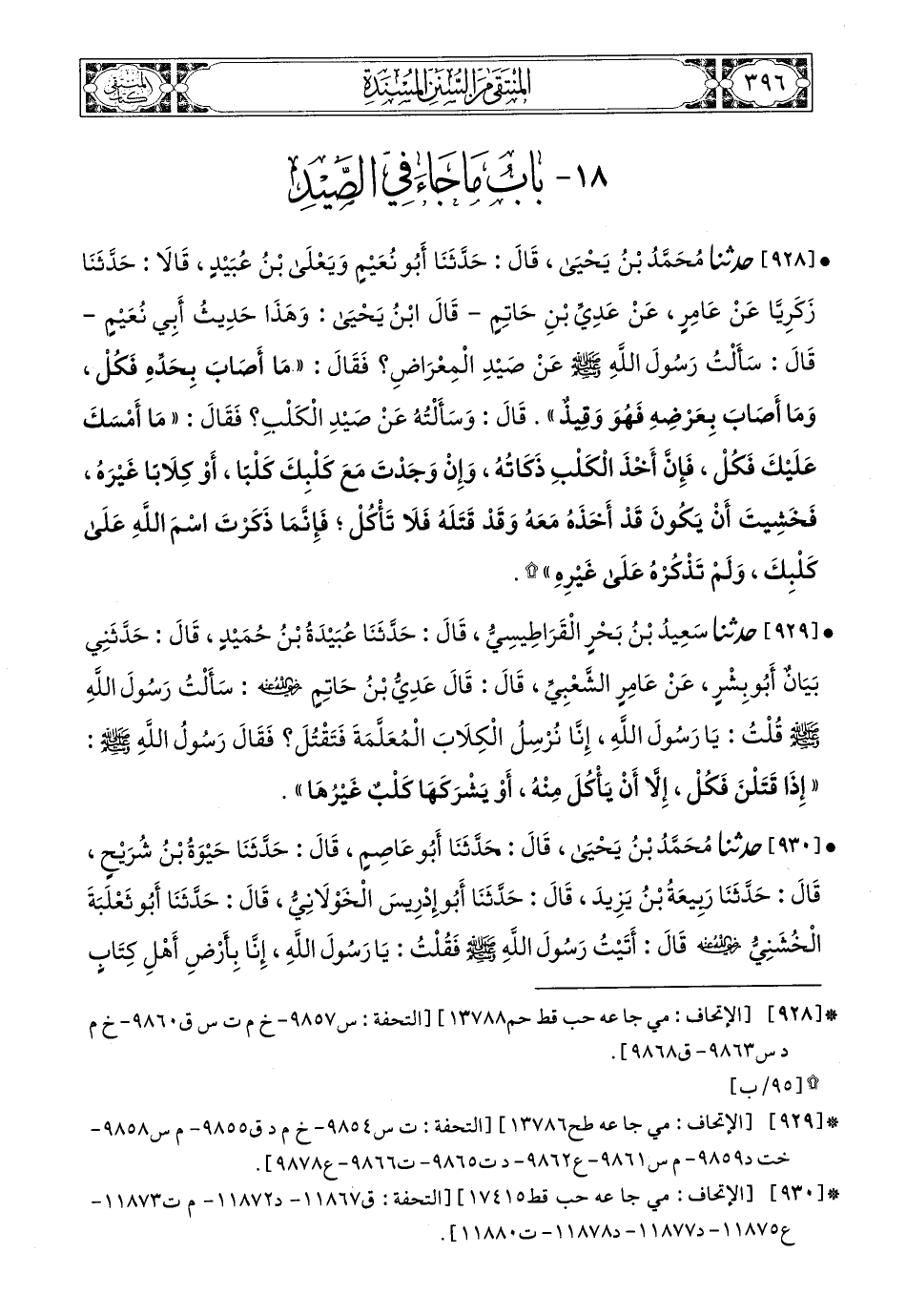 928 - حَدَّثَنَا مُحَمَّدُ بْنُ يَحْيَى، قَالَ: حَدَّثَنَا أَبُو نُعَيْمٍ، وَيَعْلَى بْنُ عُبَيْدٍ، قَالاَ: حَدَّثَنَا زَكَرِيَّا، عَنْ عَامِرٍ، عَنْ عَدِيِّ بْنِ حَاتِمٍ- قَالَ: ابْنُ يَحْيَى: وَهَذَا حَدِيثُ أَبُي نُعَيْمٍ- قَالَ: سَأَلْتُ رَسُولَ اللهِ صَلى الله عَليه وسَلم عَنْ صَيْدِ الْمِعْرَاضِ؟ فَقَالَ: مَا أَصَابَ بِحَدِّهِ فَكُلْ، وَمَا أَصَابَ بِعَرْضِهِ فَهُوَ وَقِيذٌ، قَالَ: وَسَأَلْتُهُ عَنْ صَيْدِ الْكَلْبِ؟ فَقَالَ: مَا أَمْسَكَ عَلَيْكَ فَكُلْ، فَإِنَّ أَخْذَ الْكَلْبُ ذَكَاتَهُ، وَإِنْ وَجَدْتَ مَعَ كَلْبِكَ كَلْبًا أَوْ كِلاَبًا غَيْرَهُ فَخَشِيتَ أَنْ يَكُونَ قَدْ أَخَذَهُ مَعَهُ وَقَدْ قَتَلَهُ فَلاَ تَأْكُلْ، فَإِنَّمَا ذَكَرْتَ اسْمَ اللهِ عَلَى كَلْبِكَ وَلَمْ تَذْكُرْهُ عَلَى غَيْرِهِ.