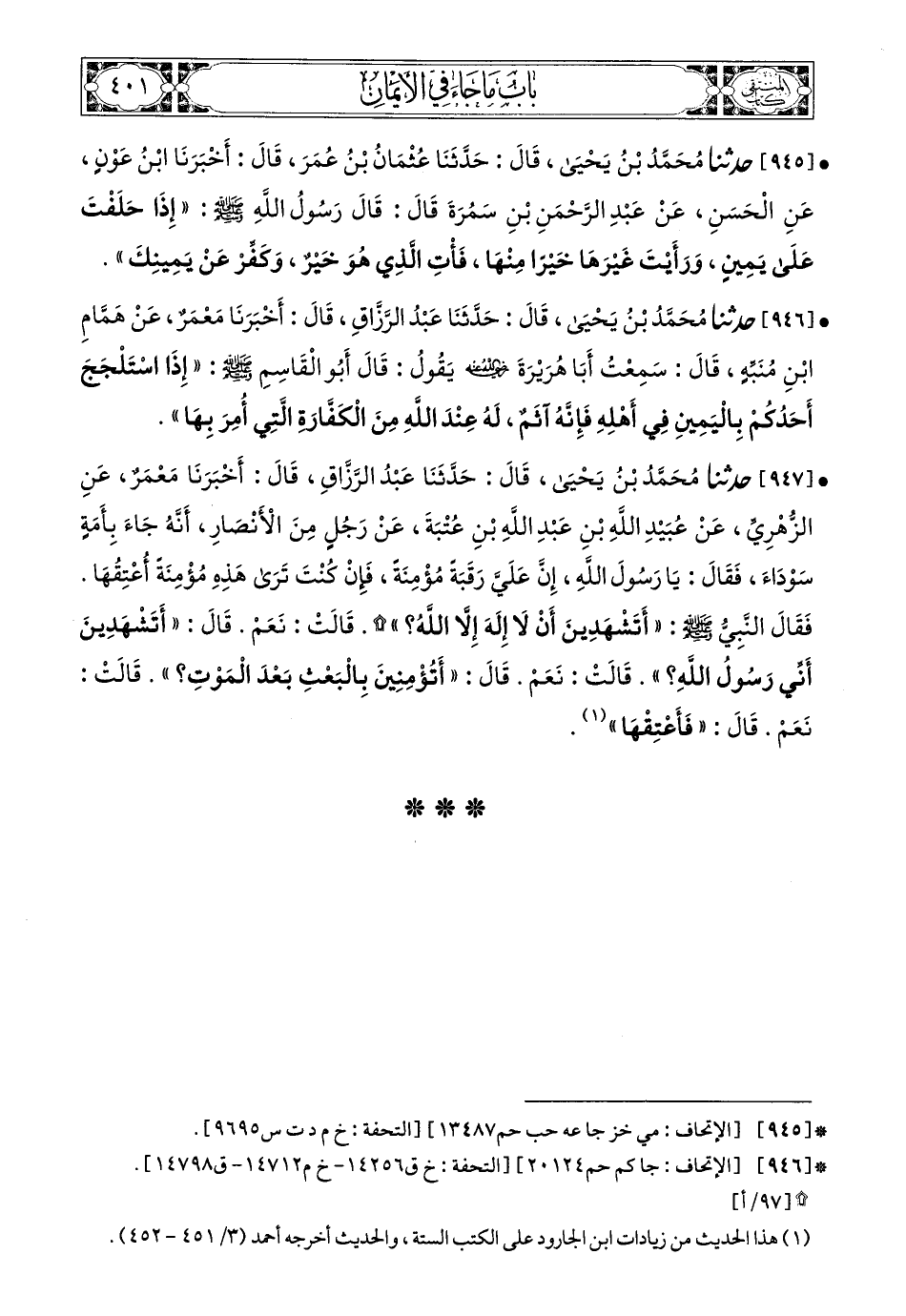 945- حَدَّثَنَا مُحَمَّدُ بْنُ يَحْيَى، قَالَ: حَدَّثَنَا عُثْمَانُ بْنُ عُمَرَ، قَالَ: أَخْبَرَنَا ابْنُ عَوْنٍ، عَنِ الْحَسَنِ، عَنْ عَبْدِ الرَّحْمَنِ بْنِ سَمُرَةَ، قَالَ: قَالَ رَسُولُ اللهِ صَلى الله عَليه وسَلم: إِذَا حَلَفْتَ عَلَى يَمِينٍ وَرَأَيْتَ غَيْرَهَا خَيْرًا مِنْهَا فَأْتِ الَّذِي هُوَ خَيْرٌ وَكَفِّرْ عَنْ يَمِينِكَ.