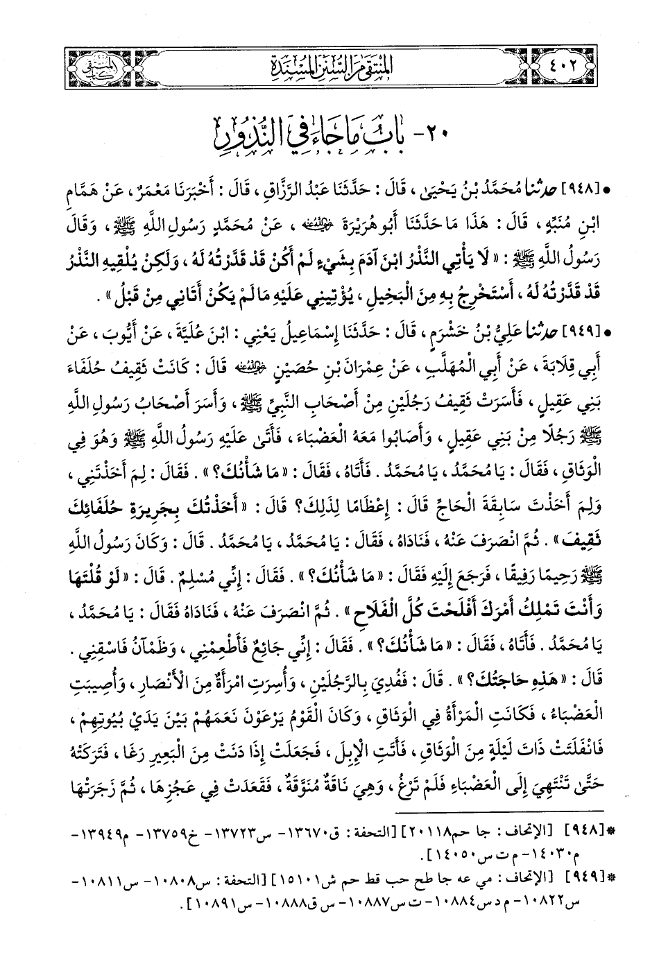 948 - حَدَّثَنَا مُحَمَّدُ بْنُ يَحْيَى، قَالَ: حَدَّثَنَا عَبْدُ الرَّزَّاقِ، قَالَ: أَخْبَرَنَا مَعْمَرٌ، عَنْ هَمَّامِ بْنِ مُنَبِّهٍ، قَالَ: هَذَا مَا حَدَّثَنَا أَبُو هُرَيْرَةَ، رَضِيَ اللهُ عَنْهُ، عَنْ مُحَمَّدٍ، رَسُولِ اللهِ صَلى الله عَليه وسَلم، وَقَالَ رَسُولُ اللهِ صَلى الله عَليه وسَلم: لاَ يَأْتِي النَّذْرُ ابْنَ آدَمَ بِشَيْءٍ لَمْ أَكُنْ قَدْ قَدَّرْتُهُ لَهُ، وَلَكِنْ يُلْقِيهِ النَّذْرُ قَدْ قَدَّرْتُهُ لَهُ أَسْتَخْرِجُ بِهِ مِنَ الْبَخِيلِ يُؤْتِينِي عَلَيْهِ مَا لَمْ يَكُنْ أَتَانِي مِنْ قَبْلُ.
