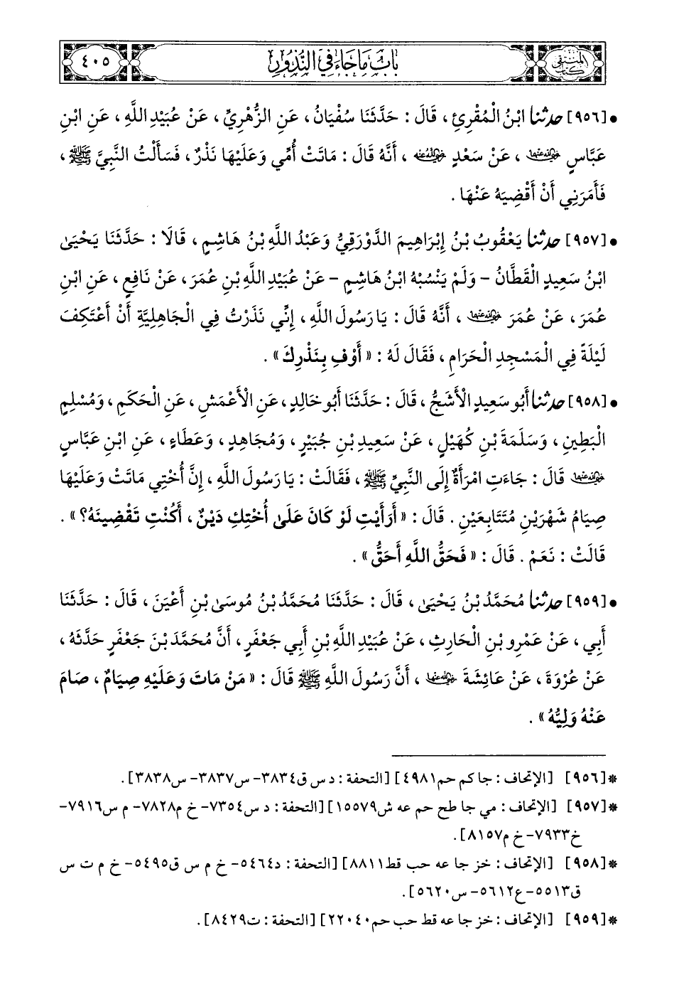 957- حَدَّثَنَا يَعْقُوبُ بْنُ إِبْرَاهِيمَ الدَّوْرَقِيُّ، وَعَبْدُ اللهِ بْنُ هَاشِمٍ، قَالاَ: حَدَّثَنَا يَحْيَى بْنُ سَعِيدٍ الْقَطَّانُ، وَلَمْ يُنْسِبْهُ ابْنُ هَاشِمٍ، عَنْ عُبَيْدِ اللهِ بْنِ عُمَرَ، عَنْ نَافِعٍ، عَنِ ابْنِ عُمَرَ، عَنْ عُمَرَ، رَضِيَ اللهُ عَنْهُمَا أَنَّهُ قَالَ: يَا رَسُولَ اللهِ إِنِّي نَذَرْتُ فِي الْجَاهِلِيَّةِ أَنْ أَعْتَكِفَ لَيْلَةً فِي الْمَسْجِدِ الْحَرَامِ، فَقَالَ لَهُ: أَوْفِ بِنَذْرِكَ.