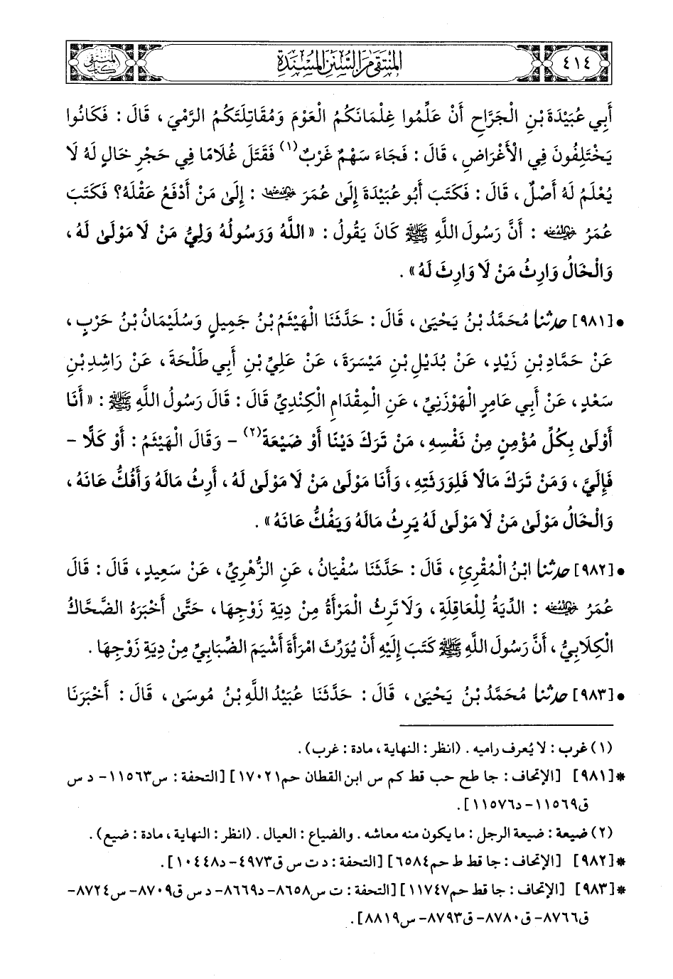 981- حَدَّثَنَا مُحَمَّدُ بْنُ يَحْيَى، قَالَ: حَدَّثَنَا الْهَيْثَمُ بْنُ جَمِيلٍ، وَسُلَيْمَانُ بْنُ حَرْبٍ، عَنْ حَمَّادِ بْنِ زَيْدٍ، عَنْ بُدَيْلِ بْنِ مَيْسَرَةَ، عَنْ عَلِيِّ بْنِ أَبِي طَلْحَةَ، عَنْ رَاشِدِ بْنِ سَعْدٍ، عَنْ أَبِي عَامِرٍ الْهَوْزَنِيِّ، عَنِ الْمِقْدَامِ الْكِنْدِيِّ، قَالَ: قَالَ رَسُولُ اللهِ صَلى الله عَليه وسَلم: أَنَا أَوْلَى بِكُلِّ مُؤْمِنٍ مِنْ نَفْسِهِ مَنْ تَرَكَ دَيْنًا أَوْ ضَيْعَةً وَقَالَ الْهَيْثَمُ أَوْ كَلاًّ فَإِلَيَّ، وَمَنْ تَرَكَ مَالاً فَلِوَرَثَتِهِ، وَأَنَا مَوْلَى مَنْ لاَ مَوْلَى لَهُ أَرِثُ مَالَهُ وَأَفُكُّ عَانَهُ، وَالْخَالُ مَوْلَى مَنْ لاَ مَوْلَى لَهُ يَرِثُ مَالَهُ وَيَفُكُّ عَانَهُ.