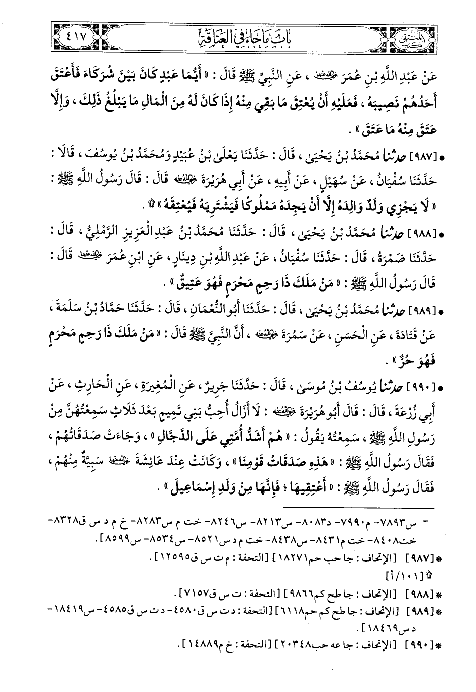 988- حَدَّثَنَا مُحَمَّدُ بْنُ يَحْيَى، قَالَ: حَدَّثَنَا مُحَمَّدُ بْنُ عَبْدِ الْعَزِيزِ الرَّمْلِيُّ، قَالَ: حَدَّثَنَا ضَمْرَةُ، قَالَ: حَدَّثَنَا سُفْيَانُ، عَنْ عَبْدِ اللهِ بْنِ دِينَارٍ، عَنِ ابْنِ عُمَرَ، رَضِيَ اللهُ عَنْهُمَا، قَالَ: قَالَ رَسُولُ اللهِ صَلى الله عَليه وسَلم: مَنْ مَلَكَ ذَا رَحِمٍ مَحْرَمٍ فَهُوَ عَتِيقٌ.