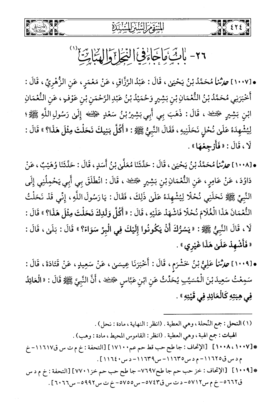 1007 - حَدَّثَنَا مُحَمَّدُ بْنُ يَحْيَى، قَالَ: حَدَّثَنَا عَبْدُ الرَّزَّاقِ، عَنْ مَعْمَرٍ، عَنِ الزُّهْرِيِّ، قَالَ: أَخْبَرَنِي مُحَمَّدُ بْنُ النُّعْمَانِ بْنِ بَشِيرٍ، وَحُمَيْدُ بْنُ عَبْدِ الرَّحْمَنِ بْنِ عَوْفٍ، عَنِ النُّعْمَانِ بْنِ بَشِيرٍ، رَضِيَ اللهُ عَنْهُمَا، قَالَ: ذَهَبَ بِي أَبِي بَشِيرُ بْنُ سَعْدٍ، رَضِيَ اللهُ عَنْهُ، إِلَى رَسُولِ اللهِ صَلى الله عَليه وسَلم لِيُشْهِدَهُ عَلَى نُحْلٍ نَحَلَنِيهِ، فَقَالَ النَّبِيُّ صَلى الله عَليه وسَلم: أَكُلَّ بَنِيكَ نَحَلْتَ مِثْلَ هَذَا؟ قَالَ: لاَ قَالَ: فَأَرْجِعْهَا.