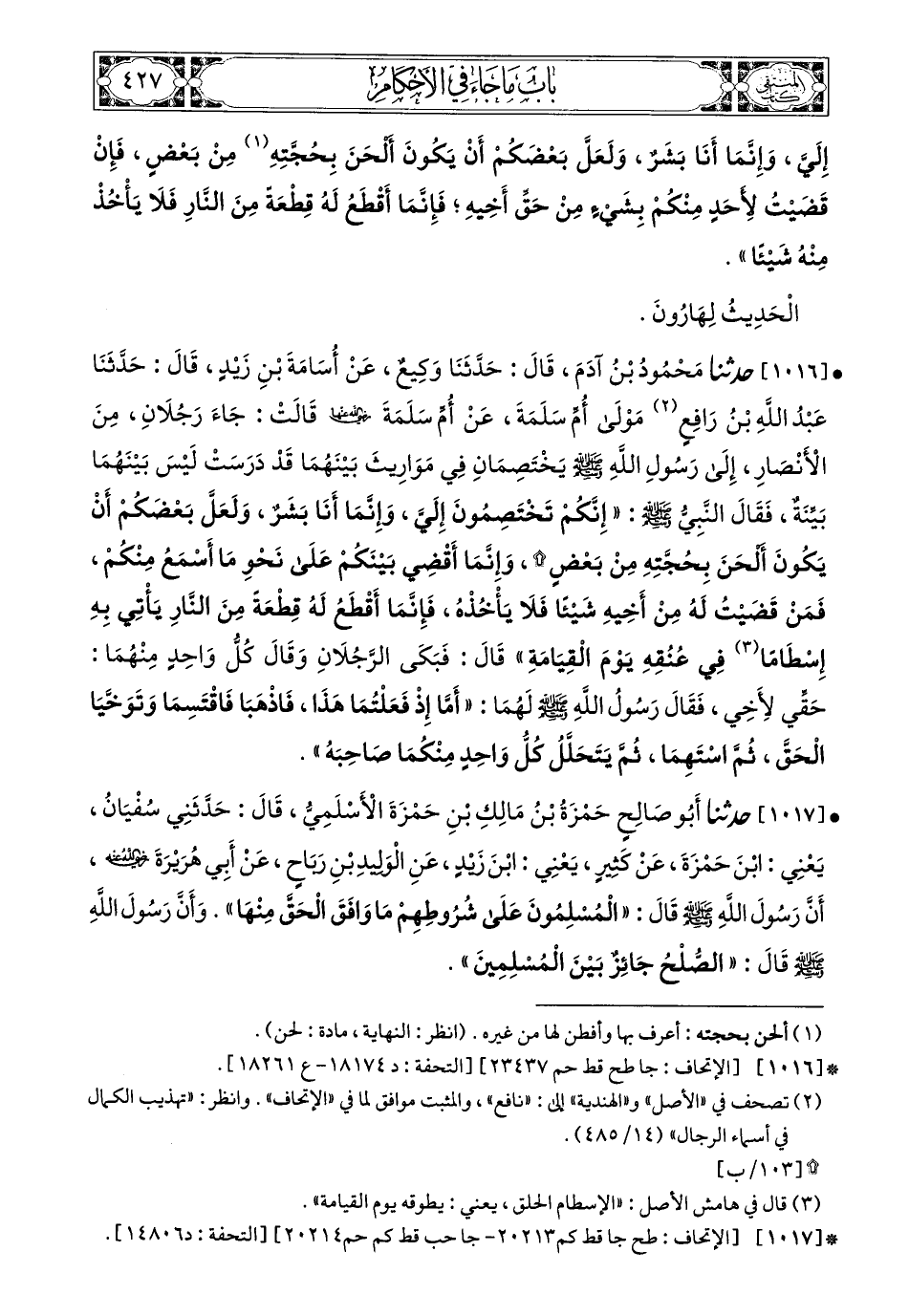 1016- حَدَّثَنَا مَحْمُودُ بْنُ آدَمَ، قَالَ: حَدَّثَنَا وَكِيعٌ، عَنْ أُسَامَةَ بْنِ زَيْدٍ، قَالَ: حَدَّثَنَا عَبْدُ اللهِ بْنُ رَافِعٍ، مَوْلَى أُمِّ سَلَمَةَ، عَنْ أُمِّ سَلَمَةَ، رَضِيَ اللهُ عَنْهَا، قَالَتْ: جَاءَ رَجُلاَنِ مِنَ الأَنْصَارِ إِلَى رَسُولِ اللهِ صَلى الله عَليه وسَلم يَخْتَصِمَانِ فِي مَوَارِيثَ بَيْنَهُمَا قَدْ دَرَسَتْ لَيْسَ بَيْنَهُمَا بَيِّنَةٌ، فَقَالَ النَّبِيُّ صَلى الله عَليه وسَلم: إِنَّكُمْ تَخْتَصِمُونَ إِلَيَّ، وَإِنَّمَا أَنَا بَشَرٌ وَلَعَلَّ بَعْضَكُمْ أَنْ يَكُونَ أَلْحَنَ بِحُجَّتِهِ مِنْ بَعْضٍ، وَإِنَّمَا أَقْضِي بَيْنَكُمْ عَلَى نَحْو مَا أَسْمَعُ مِنْكُمْ فَمَنْ قَضَيْتُ لَهُ مِنْ أَخِيهِ شَيْئًا فَلاَ يَأْخُذْهُ فَإِنَّمَا أَقْطَعُ لَهُ قِطْعَةً مِنَ النَّارِ يَأْتِي بِهِ إِسْطَامًا فِي عُنُقِهِ يَوْمَ الْقِيَامَةِ، قَالَ: فَبَكَى الرَّجُلاَنِ وَقَالَ كُلُّ وَاحِدٍ مِنْهُمَا: حَقِّي لأَخِي، فَقَالَ رَسُولُ اللهِ صَلى الله عَليه وسَلم لَهُمَا: أَمَّا إِذْ فَعَلْتُمَا هَذَا فَاذْهَبَا فَاقْتَسِمَا وَتَوَخَّيَا الْحَقَّ، ثُمَّ اسْتَهِمَا، ثُمَّ يَتَحْلِلْ كُلُّ وَاحِدٍ مِنْكُمَا صَاحِبَهُ.