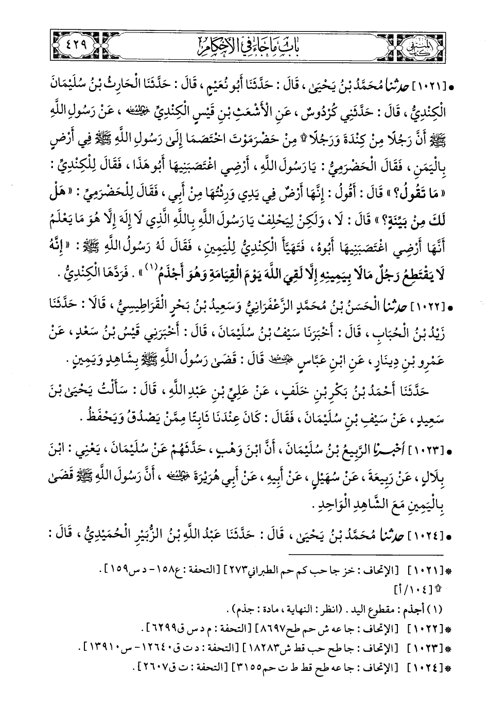 1021- حَدَّثَنَا مُحَمَّدُ بْنُ يَحْيَى، قَالَ: حَدَّثَنَا أَبُو نُعَيْمٍ، قَالَ: حَدَّثَنَا الْحَارِثُ بْنُ سُلَيْمَانَ الْكِنْدِيُّ، قَالَ: حَدَّثَنِي كُرْدُوسٌ، عَنِ الأَشْعَثِ بْنِ قَيْسٍ الْكِنْدِيِّ، رَضِيَ اللهُ عَنْهُ، عَنْ رَسُولِ اللهِ صَلى الله عَليه وسَلم أَنَّ رَجُلاً مِنْ كِنْدَةَ، وَرَجُلاً مِنْ حَضْرَمَوْتَ اخْتَصَمَا إِلَى رَسُولِ اللهِ صَلى الله عَليه وسَلم فِي أَرْضٍ بِالْيَمَنِ، فَقَالَ الْحَضْرَمِيُّ: يَا رَسُولَ اللهِ أَرْضِي اغْتَصَبَنِيهَا أَبُو هَذَا، فَقَالَ لِلْكِنْدِيِّ: مَا تَقُولُ؟ قَالَ: أَقُولُ: إِنَّهَا أَرْضٌ فِي يَدِي وَرِثْتُهَا مِنْ أَبِي، فَقَالَ لِلْحَضْرَمِيِّ: هَلْ لَكَ مِنْ بَيِّنَةٍ؟ قَالَ: لاَ، وَلَكِنْ لِيَحْلِفْ يَا رَسُولَ اللهِ بِاللَّهِ الَّذِي لاَ إِلَهَ إِلاَّ هُوَ مَا يَعْلَمُ أَنَّهَا أَرْضِي اغْتَصَبَنِيهَا أَبُوهُ، فَتَهَيَّأَ الْكِنْدِيُّ لِلْيَمِينِ، فَقَالَ لَهُ رَسُولُ اللهِ صَلى الله عَليه وسَلم: إِنَّهُ لاَ يَقْتَطِعُ رَجُلٌ مَالاً بِيَمِينِهِ إِلاَّ لَقِيَ اللَّهَ يَوْمَ الْقِيَامَةِ وَهُوَ أَجْذَمُ فَرَدَّهَا الْكِنْدِيُّ.