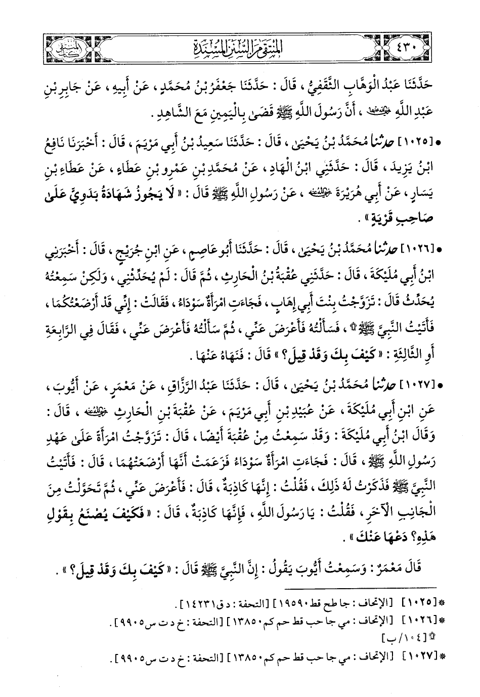 1025- حَدَّثَنَا مُحَمَّدُ بْنُ يَحْيَى، قَالَ: حَدَّثَنَا سَعِيدُ بْنُ أَبِي مَرْيَمَ، قَالَ: أَخْبَرَنَا نَافِعُ بْنُ يَزِيدَ، قَالَ: حَدَّثَنِي ابْنُ الْهَادِ، عَنْ مُحَمَّدِ بْنِ عَمْرِو بْنِ عَطَاءٍ، عَنْ عَطَاءِ بْنِ يَسَارٍ، عَنْ أَبِي هُرَيْرَةَ، رَضِيَ اللهُ عَنْهُ، عَنْ رَسُولِ اللهِ صَلى الله عَليه وسَلم قَالَ: لاَ يَجُوزُ شَهَادَةُ بَدَوِيٍّ عَلَى صَاحِبِ قَرْيَةٍ.