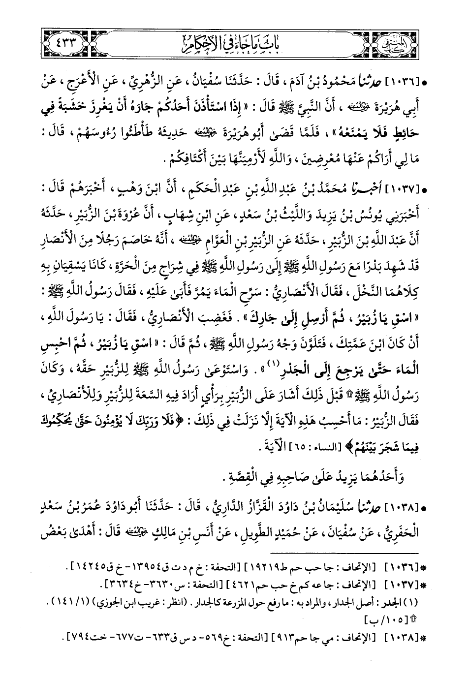 1037- أَخْبَرَنَا مُحَمَّدُ بْنُ عَبْدِ اللهِ بْنِ عَبْدِ الْحَكَمِ، أَنَّ ابْنَ وَهْبٍ أَخْبَرَهُمْ، قَالَ: أَخْبَرَنِي يُونُسُ بْنُ يَزِيدَ، وَاللَّيْثُ بْنُ سَعْدٍ، عَنِ ابْنِ شِهَابٍ، أَنَّ عُرْوَةَ بْنَ الزُّبَيْرِ، حَدَّثَهُ أَنَّ عَبْدَ اللهِ بْنَ الزُّبَيْرِ حَدَّثَهُ، عَنِ الزُّبَيْرِ بْنِ الْعَوَّامِ، رَضِيَ اللهُ عَنْهُ، أَنَّهُ خَاصَمَ رَجُلاً مِنَ الأَنْصَارِ قَدْ شَهِدَ بَدْرًا مَعَ رَسُولِ اللهِ صَلى الله عَليه وسَلم إِلَى رَسُولِ اللهِ صَلى الله عَليه وسَلم فِي شِرَاجٍ مِنَ الْحَرَّةِ كَانَا يَسْقِيَانِ بِهِ كِلاَهُمَا النَّخْلَ، فَقَالَ الأَنْصَارِيُّ: سَرِّحِ الْمَاءَ يَمُرُّ فَأَبَى عَلَيْهِ، فَقَالَ رَسُولُ اللهِ صَلى الله عَليه وسَلم: اسْقِ يَا زُبَيْرُ، ثُمَّ أَرْسِل إِلَى جَارِكَ، فَغَضِبَ الأَنْصَارِيُّ، قَالَ: يَا رَسُولَ اللهِ أَنْ كَانَ ابْنَ عَمَّتِكَ، فَتَلَوَّنَ وَجْهُ رَسُولُ اللهِ صَلى الله عَليه وسَلم، ثُمَّ قَالَ: اسْقِ يَا زُبَيْرُ، ثُمَّ احْبِسِ الْمَاءَ حَتَّى يَرْجِعَ إِلَى الْجَدْرِ، وَاسْتَوْعَى رَسُولُ اللهِ صَلى الله عَليه وسَلم لِلزُّبَيْرِ حَقَّهُ، وَكَانَ رَسُولُ اللهِ صَلى الله عَليه وسَلم قَبْلَ ذَلِكَ أَشَارَ عَلَى الزُّبَيْرِ بِرَأْيٍ أَرَادَ فِيهِ السَّعَةَ لِلزُّبَيْرِ وَلِلأَنْصَارِيِّ، فَقَالَ الزُّبَيْرُ: مَا أَحْسَبُ هَذِهِ الآيَةَ إِلاَّ نَزَلَتْ فِي ذَلِكَ {فَلاَ وَرَبِّكَ لاَ يُؤْمِنُونَ حَتَّى يُحَكِّمُوكَ فِيمَا شَجَرَ بَيْنَهُمْ} [النساء 65] الآيَةَ، وَأَحَدُهُمَا يَزِيدُ عَلَى صَاحِبِهِ فِي الْقِصَّةِ.