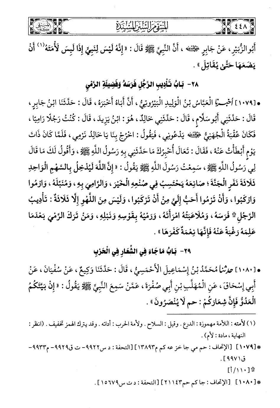 1079 - أَخْبَرَنَا الْعَبَّاسُ بْنُ الْوَلِيدِ الْبَيْرُوتِيُّ، أَنَّ أَبَاهُ، أَخْبَرَهُ قَالَ: حَدَّثَنَا ابْنُ جَابِرٍ، قَالَ: حَدَّثَنِي أَبُو سَلاَّمٍ قَالَ: حَدَّثَنِي خَالِدٌ هُوَ ابْنُ يَزِيدَ قَالَ: كُنْتُ رَجُلاً رَامِيًا، فَكَانَ عُقْبَةُ الْجُهَنِيُّ، رَضِيَ اللهُ عَنْهُ يَدْعُونِي، فَيَقُولُ: اخْرُجْ بِنَا يَا خَالِدُ نَرْمِي، فَلَمَّا كَانَ ذَاتَ يَوْمٍ أَبْطَأْتُ عَنْهُ، فَقَالَ: تَعَالَ أُخْبِرُكَ مَا حَدَّثَنِي بِهِ رَسُولُ اللهِ صَلى الله عَليه وسَلم، وَأَقُولْ لَكَ مَا قَالَ لِي رَسُولُ اللهِ صَلى الله عَليه وسَلم، سَمِعْتُ رَسُولَ اللهِ صَلى الله عَليه وسَلم يَقُولُ: إِنَّ اللَّهَ لَيُدْخِلُ بِالسَّهْمِ الْوَاحِدِ ثَلاَثَةَ نَفَرٍ الْجَنَّةَ صَانِعَهُ يَحْتَسِبُ فِي صُنْعِهِ الْخَيْرَ، وَالرَّامِيَ بِهِ، وَمُنَبِّلَهُ، وَارْمُوا وَارْكَبُوا، وَأَنْ تَرْمُوا أَحَبُّ إِلَيَّ مِنْ أَنْ تَرْكَبُوا، وَلَيْسَ مِنَ اللَّهْوِ إِلاَّ ثَلاَثَةٌ: تَأْدِيبُ الرَّجُلِ فَرَسَهُ، وَمُلاَعَبَتُهُ امْرَأَتَهُ، وَرَمْيُهُ بِقَوْسِهِ وَنَبْلِهِ، وَمَنْ تَرَكَ الرَّمْيَ بَعْدَمَا عَلِمَهُ رَغْبَةً عَنْهُ فَإِنَّهَا نِعْمَةٌ كَفَرَهَا.