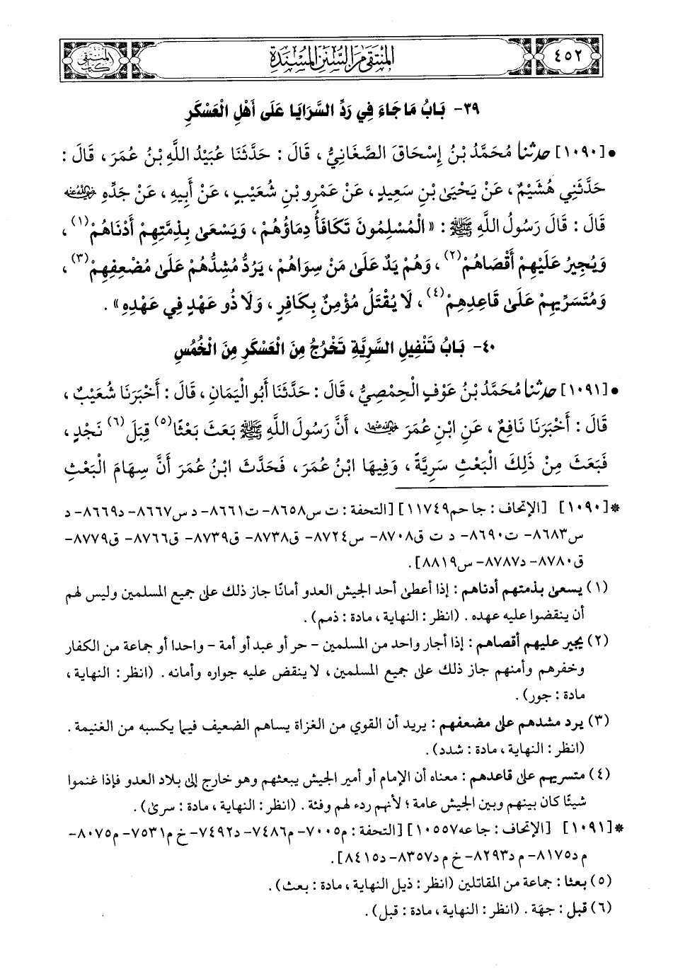 1090 - حَدَّثَنَا مُحَمَّدُ بْنُ إِسْحَاقَ الصَّغَانِيُّ، قَالَ: حَدَّثَنَا عُبَيْدُ اللهِ بْنُ عُمَرَ، قَالَ: حَدَّثَنِي هُشَيْمٌ، عَنْ يَحْيَى بْنِ سَعِيدٍ، عَنْ عَمْرِو بْنِ شُعَيْبٍ، عَنْ أَبِيهِ، عَنْ جَدِّهِ رَضِيَ اللهُ عَنْهُ، قَالَ: قَالَ رَسُولُ اللهِ صَلى الله عَليه وسَلم: الْمُسْلِمُونَ تَتَكَافَأُ دِمَاؤُهُمْ، وَيَسْعَى بِذِمَّتِهِمْ أَدْنَاهُمْ، وَيُجِيرُ عَلَيْهِمْ أَقْصَاهُمْ، وَهُمْ يَدٌ عَلَى مَنْ سِوَاهُمْ، يَرُدُّ مُشِدُّهُمْ عَلَى مُضْعِفِهِمْ وَمُتَسَرِّيهِمْ عَلَى قَاعِدِهِمْ، لاَ يُقْتَلُ مُؤْمِنٌ بِكَافِرٍ وَلاَ ذُو عَهْدٍ فِي عَهْدِهِ.