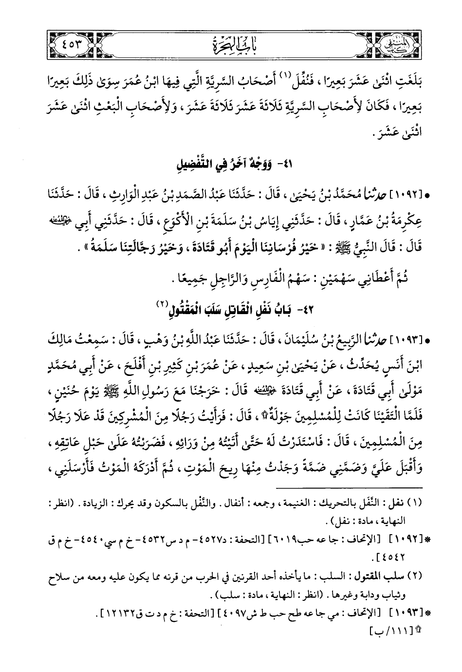 1093 - حَدَّثَنَا الرَّبِيعُ بْنُ سُلَيْمَانَ، قَالَ: حَدَّثَنَا عَبْدُ اللهِ بْنُ وَهْبٍ، قَالَ: سَمِعْتُ مَالِكَ بْنَ أَنَسٍ يُحَدِّثُ، عَنْ يَحْيَى بْنِ سَعِيدٍ، عَنْ عُمَرَ بْنِ كَثِيرِ بْنِ أَفْلَحَ، عَنْ أَبِي مُحَمَّدٍ مَوْلَى أَبِي قَتَادَةَ، عَنْ أَبِي قَتَادَةَ، رَضِيَ اللهُ عَنْهُ، قَالَ: خَرَجْنَا مَعَ رَسُولِ اللهِ صَلى الله عَليه وسَلم يَوْمَ حُنَيْنٍ، فَلَمَّا الْتَقَيْنَا كَانَتْ لِلْمُسْلِمِينَ جَوْلَةٌ، قَالَ: فَرَأَيْتُ رَجُلاً مِنَ الْمُشْرِكِينَ قَدْ عَلاَ رَجُلاً مِنَ الْمُسْلِمِينَ، قَالَ: فَاسْتَدَرْتُ لَهُ حَتَّى أَتَيْتُهُ مِنْ وَرَائِهِ، فَضَرَبْتُهُ عَلَى حَبَلِ عَاتِقِهِ، وَأَقْبَلَ عَلَيَّ وَضَمَّنِي ضَمَّةً وَجَدْتُ مِنْهَا رِيحَ الْمَوْتِ، ثُمَّ أَدْرَكَهُ الْمَوْتُ فَأَرْسَلَنِي، فَلَحِقْتُ عُمَرَ بْنَ الْخَطَّابِ، رَضِيَ اللهُ عَنْهُ، فَقُلْتُ: مَا بَالُ النَّاسِ؟ قَالَ: أَمْرُ اللهِ، قَالَ: ثُمَّ إِنَّ النَّاسَ رَجَعُوا، وَجَلَسَ رَسُولُ اللهِ صَلى الله عَليه وسَلم، فَقَالَ: مَنْ قَتَلَ قَتِيلاً لَهُ عَلَيْهِ بَيِّنَةٌ فَلَهُ سَلَبُهُ، قَالَ أَبُو قَتَادَةَ: فَقُمْتُ فَقُلْتُ مَنْ يَشْهَدُ لِي؟، ثُمَّ جَلَسْتُ، ثُمَّ قَالَ: مَنْ قَتَلَ قَتِيلاً لَهُ عَلَيْهِ بَيِّنَةٌ فَلَهُ سَلَبُهُ، قَالَ: فَقُمْتُ فَقُلْتُ: مَنْ يَشْهَدُ لِي؟، ثُمَّ جَلَسْتُ، ثُمَّ قَالَ ذَلِكَ الثَّالِثَةَ، فَقُمْتُ، فَقَالَ لِي رَسُولُ اللهِ صَلى الله عَليه وسَلم: مَا لَكَ يَا أَبَا قَتَادَةَ، قَالَ: فَقَصَصْتُ عَلَيْهِ الْقِصَّةَ، فَقَالَ رَجُلٌ مِنَ الْقَوْمِ: صَدَقَ يَا رَسُولَ اللهِ، وَسَلَبُ ذَلِكَ الْقَتِيلِ عِنْدِي فَارْضِهِ مِنْ حَقِّهِ، فَقَالَ أَبُو بَكْرٍ الصِّدِّيقُ، رَضِيَ اللهُ عَنْهُ: لاَهَا اللهِ، إِذًا لاَ يَعْمِدُ إِلَى أَسَدٍ مِنْ أُسُدِ اللهِ يُقَاتِلُ عَنِ اللهِ وَرَسُولِهِ فَيُعْطِيكَ سَلَبَهُ، فَقَالَ رَسُولُ اللهِ صَلى الله عَليه وسَلم: صَدَقَ أَعْطِهِ إِيَّاهُ، فَأَعْطَانِي، قَالَ: فَبِعْتُ الدِّرْعَ فَابْتَعْتُ بِهِ مَخْرَفًا فِي بَنِي سَلَمَةَ، فَإِنَّهُ لأَوَّلُ مَالٍ تَأَثَّلْتُهُ فِي الإِسْلاَمِ.