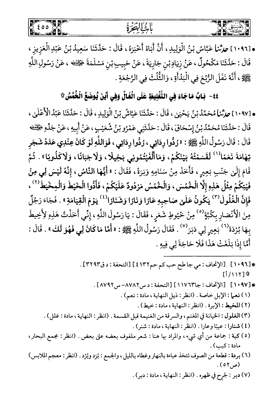 1097 - حَدَّثَنَا مُحَمَّدُ بْنُ يَحْيَى، قَالَ: حَدَّثَنَا عَيَّاشُ بْنُ الْوَلِيدِ، قَالَ: حَدَّثَنَا عَبْدُ الأَعْلَى، قَالَ: حَدَّثَنَا مُحَمَّدُ بْنُ إِسْحَاقَ، قَالَ: حَدَّثَنِي عَمْرُو بْنُ شُعَيْبٍ، عَنْ أَبِيهِ، عَنْ جَدِّهِ، رَضِيَ اللهُ عَنْهُ، قَالَ: قَالَ رَسُولُ اللهِ صَلى الله عَليه وسَلم: رُدُّوا رِدَائِي، رُدُّوا رِدَائِي، فَوَاللَّهِ لَوْ كَانَ عِنْدِي عَدَدُ شَجَرِ تِهَامَةَ نَعَمًا لَقَسَمْتُهُ بَيْنَكُمْ، وَمَا أَلْفَيْتُمُونِي بَخِيلاً وَلاَ جَبَانًا وَلاَ كَذُوبًا، ثُمَّ قَامَ إِلَى جَنْبِ بَعِيرٍ فَأَخَذَ مِنْ سَنَامِهِ وَبَرَةً، فَقَالَ: أَيُّهَا النَّاسُ إِنَّهُ لَيْسَ لِي مِنْ فَيْئِكُمْ مِثْلَ هَذِهِ إِلاَّ الْخُمُسَ وَالْخُمُسُ مَرْدُودٌ عَلَيْكُمْ، فَأَدُّوا الْخَيْطَ وَالْمَخِيطَ، فَإِنَّ الْغُلُولَ يَكُونُ عَلَى صَاحِبِهِ عَارًا وَنَارًا وَشَنَارًا يَوْمَ الْقِيَامَةِ، فَجَاءَ رَجُلٌ مِنَ الأَنْصَارِ بِكُبَّةٍ مِنْ خُيُوطِ شَعَرٍ، فَقَالَ: يَا رَسُولَ اللهِ إِنِّي أَخَذْتُ هَذِهِ لاِخِيطَ بِهَا بُرْدَةَ بَعِيرٍ لِي دَبَرَ، فَقَالَ رَسُولُ اللهِ صَلى الله عَليه وسَلم: أَمَّا مَا كَانَ لِي فَهُوَ لَكَ، قَالَ أَمَّا إِذَا بَلَغَتْ هَذَا فَلاَ حَاجَةَ لِي فِيهِ.