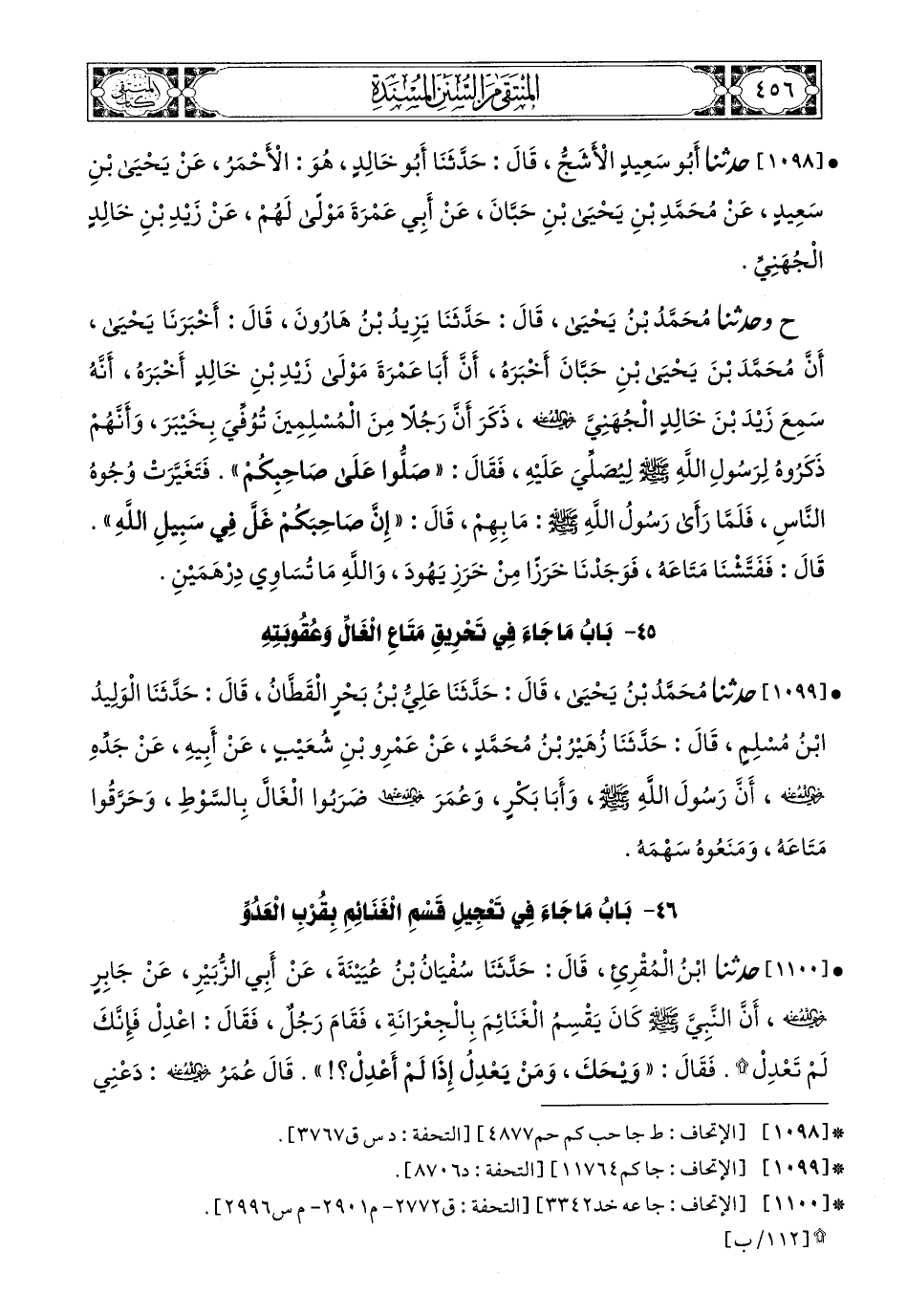 1098- حَدَّثَنَا أَبُو سَعِيدٍ الأَشَجُّ، قَالَ: حَدَّثَنَا أَبُو خَالِدٍ هُوَ الأَحْمَرُ، عَنْ يَحْيَى بْنِ سَعِيدٍ، عَنْ مُحَمَّدِ بْنِ يَحْيَى بْنِ حَبَّانَ، عَنْ أَبِي عَمْرَةَ، مَوْلًى لَهُمْ، عَنْ زَيْدِ بْنِ خَالِدٍ الْجُهَنِيِّ (ح) وَحَدَّثَنَا مُحَمَّدُ بْنُ يَحْيَى، قَالَ: حَدَّثَنَا يَزِيدُ بْنُ هَارُونَ، قَالَ: أَخْبَرَنَا يَحْيَى، أَنَّ مُحَمَّدَ بْنَ يَحْيَى بْنِ حَبَّانَ، أَخْبَرَهُ أَنَّ أَبَا عَمْرَةَ مَوْلَى زَيْدِ بْنِ خَالِدٍ، أَخْبَرَهُ أَنَّهُ سَمِعَ زَيْدَ بْنَ خَالِدٍ الْجُهَنِيَّ، رَضِيَ اللهُ عَنْهُ، ذَكَرَ أَنَّ رَجُلاً مِنَ الْمُسْلِمِينَ تُوُفِّيَ بِخَيْبَرَ، وَأَنَّهُمْ ذَكَرُوهُ لِرَسُولِ اللهِ صَلى الله عَليه وسَلم لِيُصَلِّيَ عَلَيْهِ فَقَالَ: صَلُّوا عَلَى صَاحِبِكُمْ، فَتَغَيَّرَتْ وُجُوهُ النَّاسِ، فَلَمَّا رَأَى رَسُولُ اللهِ صَلى الله عَليه وسَلم مَا بِهِمْ قَالَ: إِنَّ صَاحِبَكُمْ غَلَّ فِي سَبِيلِ اللهِ، قَالَ: فَفَتَّشْنَا مَتَاعَهُ فَوَجَدْنَا خَرَزًا مِنْ خَرَزِ يَهُودَ، وَاللَّهِ مَا تُسَاوِي دِرْهَمَيْنِ.