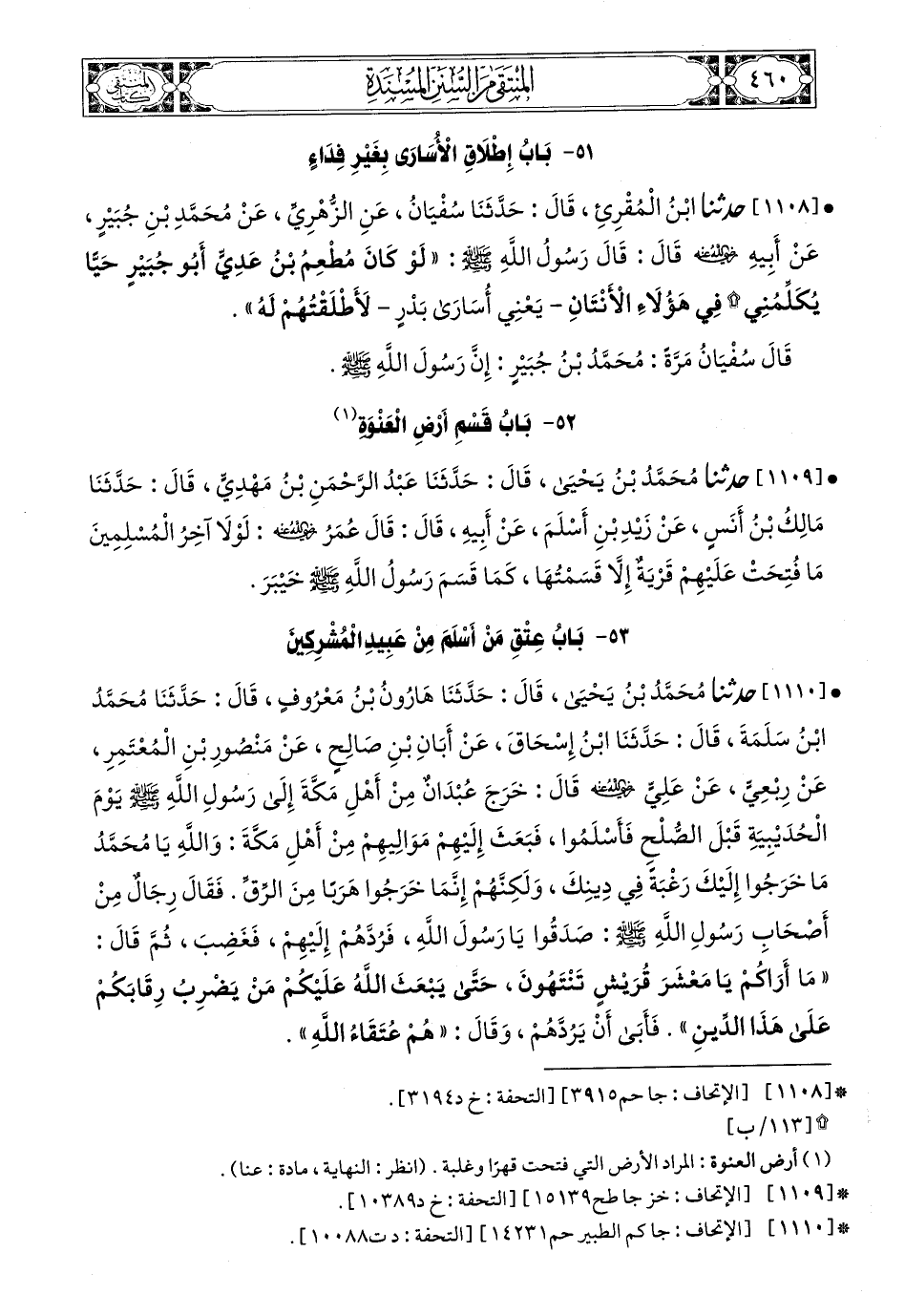 1108 - حَدَّثَنَا ابْنُ الْمُقْرِئِ، قَالَ: حَدَّثَنَا سُفْيَانُ، عَنِ الزُّهْرِيِّ، عَنْ مُحَمَّدِ بْنِ جُبَيْرٍ، عَنْ أَبِيهِ، رَضِيَ اللهُ عَنْهُ، قَالَ: قَالَ رَسُولُ اللهِ صَلى الله عَليه وسَلم: لَوْ كَانَ مُطْعِمُ بْنُ عَدِيٍّ أَبُو جُبَيْرٍ حَيًّا يُكَلِّمُنِي فِي هَؤُلاَءِ الأَنْتَانِ- يَعْنِي أُسَارَى بَدْرٍ- لأَطْلَقْتُهُمْ لَهُ.