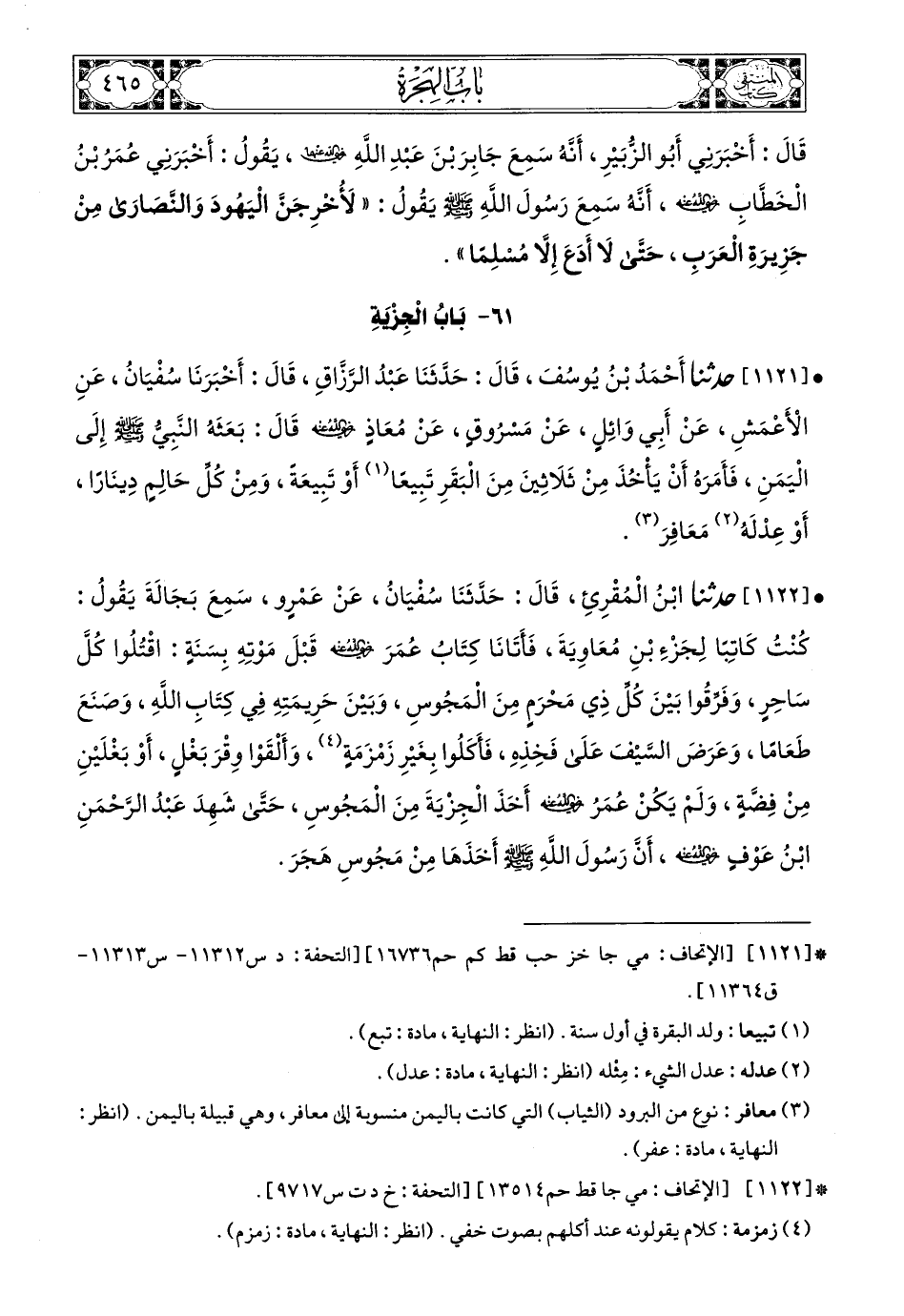 1122 - حَدَّثَنَا ابْنُ الْمُقْرِئِ، قَالَ: حَدَّثَنَا سُفْيَانُ، عَنْ عَمْرٍو، سَمِعَ بَجَالَةَ، يَقُولُ: كُنْتُ كَاتِبًا لِجَزْءِ بْنِ مُعَاوِيَةَ، فَأَتَانَا كِتَابُ عُمَرَ، رَضِيَ اللهُ عَنْهُ، قَبْلَ مَوْتِهِ بِسَنَةٍ: اقْتُلُوا كُلَّ سَاحِرٍ، وَفَرِّقُوا بَيْنَ كُلِّ ذِي مَحْرَمٍ مِنَ الْمَجُوسِ وَبَيْنَ حَرِيمَتِهِ فِي كِتَابِ اللهِ، وَصَنَعَ طَعَامًا وَعَرَضَ السَّيْفَ عَلَى فَخِذِهِ فَأَكَلُوا بِغَيْرِ زَمْزَمَةٍ، وَأَلْقَوْا وَقْرَ بَغْلٍ أَوْ بَغْلَيْنِ مِنْ فِضَّةٍ، وَلَمْ يَكُنْ عُمَرُ، رَضِيَ اللهُ عَنْهُ، أَخَذَ الْجِزْيَةَ مِنَ الْمَجُوسِ حَتَّى شَهِدَ عَبْدُ الرَّحْمَنِ بْنُ عَوْفٍ، رَضِيَ اللهُ عَنْهُ، أَنَّ رَسُولَ اللهِ صَلى الله عَليه وسَلم أَخَذَهَا مِنْ مَجُوسِ هَجَرَ.