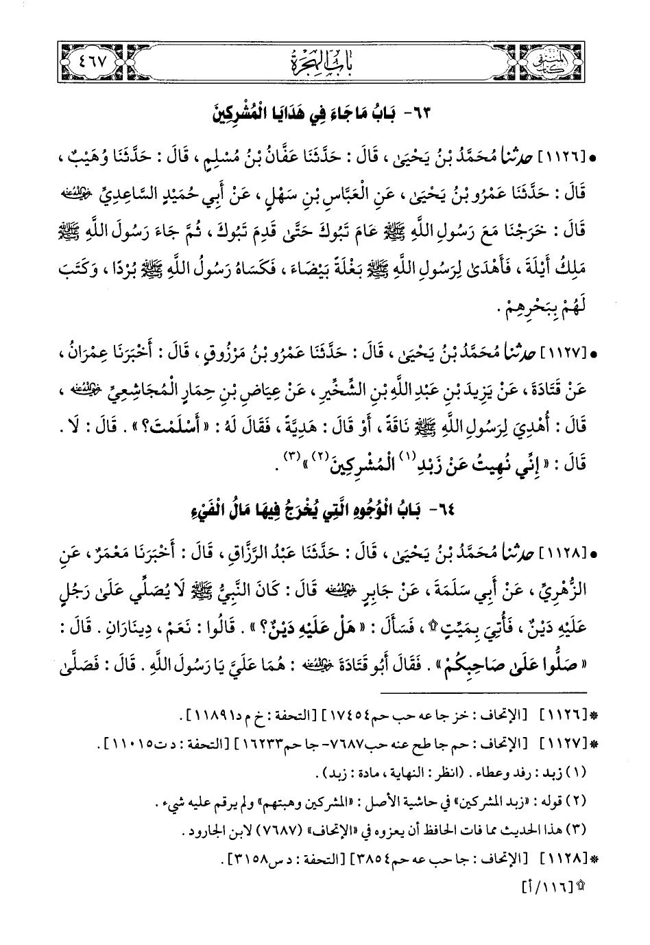 1127- حَدَّثَنَا مُحَمَّدُ بْنُ يَحْيَى، قَالَ: حَدَّثَنَا عَمْرُو بْنُ مَرْزُوقٍ، قَالَ: أَخْبَرَنَا عِمْرَانُ، عَنْ قَتَادَةَ، عَنْ يَزِيدَ بْنِ عَبْدِ اللهِ بْنِ الشِّخِّيرِ، عَنْ عِيَاضِ بْنِ حِمَارٍ الْمُجَاشِعِيِّ، رَضِيَ اللهُ عَنْهُ، قَالَ: أُهْدِيَ لِرَسُولِ اللهِ صَلى الله عَليه وسَلم نَاقَةً، أَوْ قَالَ: هَدِيَّةً، فَقَالَ لَهُ: أَسْلَمْتَ؟ قَالَ: لاَ، قَالَ: إِنِّي نَهَيْتُ عَنْ زَبَدِ الْمُشْرِكِينَ.