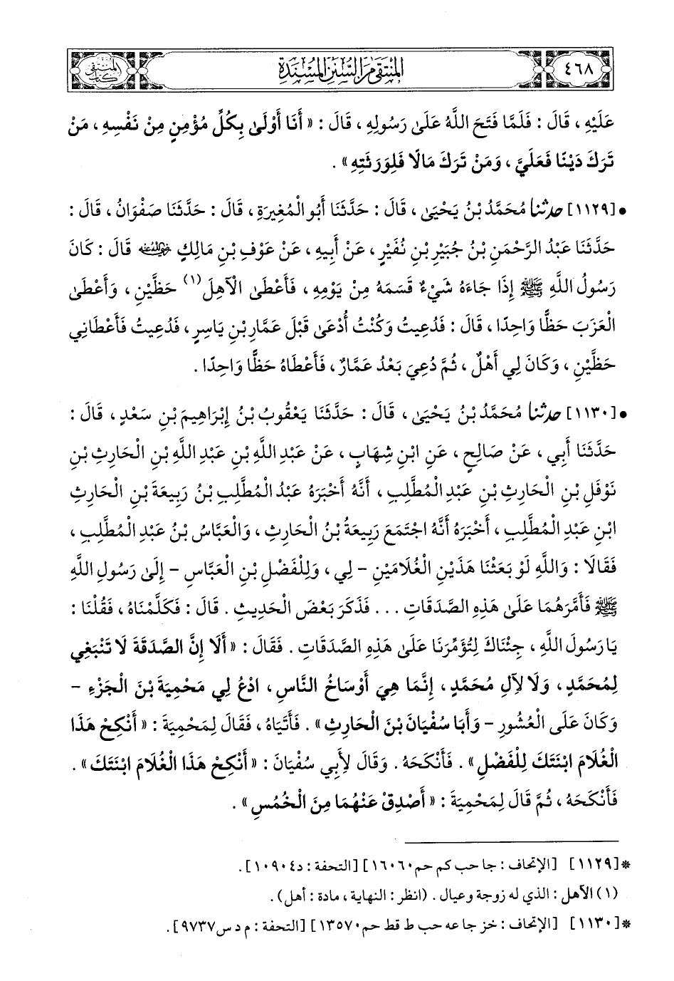 1130- حَدَّثَنَا مُحَمَّدُ بْنُ يَحْيَى، قَالَ: حَدَّثَنَا يَعْقُوبُ بْنُ إِبْرَاهِيمَ بْنِ سَعْدٍ، قَالَ: حَدَّثَنَا أَبِي، عَنْ صَالِحٍ، عَنِ ابْنِ شِهَابٍ، عَنْ عَبْدِ اللهِ بْنِ عَبْدِ اللهِ بْنِ الْحَارِثِ بْنِ نَوْفَلِ بْنِ الْحَارِثِ بْنِ عَبْدِ الْمُطَّلِبِ، أَنَّهُ أَخْبَرَهُ عَبْدُ الْمُطَّلِبِ بْنُ رَبِيعَةَ بْنِ الْحَارِثِ بْنِ عَبْدِ الْمُطَّلِبِ، أَخْبَرَهُ أَنَّهُ اجْتَمَعَ رَبِيعَةُ بْنُ الْحَارِثِ وَالْعَبَّاسُ بْنُ عَبْدِ الْمُطَّلِبِ، فَقَالاَ: وَاللَّهِ لَوْ بَعَثْنَا هَذَيْنِ الْغُلاَمَيْنِ- لِي وَلِلْفَضْلِ بْنِ الْعَبَّاسِ- إِلَى رَسُولِ اللهِ صَلى الله عَليه وسَلم فَأَمَّرَهُمَا عَلَى هَذِهِ الصَّدَقَاتِ، ... فَذَكَرَ بَعْضَ الْحَدِيثِ، قَالَ: فَكَلَّمْنَاهُ فَقُلْنَا: يَا رَسُولَ اللهِ جِئْنَاكَ لِتُؤَمِّرَنَا عَلَى هَذِهِ الصَّدَقَاتِ، فَقَالَ: أَلاَ إِنَّ الصَّدَقَةَ لاَ تَنْبَغِي لِمُحَمَّدٍ، وَلاَ لاِلِ مُحَمَّدٍ، إِنَّمَا هِيَ أَوْسَاخُ النَّاسِ، ادْعُ لِي مَحْمِيَةَ بْنَ الْجُزْءِ، وَكَانَ عَلَى الْعُشُورِ، وَأَبَا سُفْيَانَ بْنَ الْحَارِثِ فَأَتَيَاهُ، فَقَالَ لِمَحْمِيَةَ: أَنْكِحْ هَذَا الْغُلاَمَ ابْنَتَكَ لِلْفَضْلِ فَأَنْكَحَهُ، وَقَالَ لأَبِي سُفْيَانَ: أَنْكِحْ هَذَا الْغُلاَمَ ابْنَتَكَ، فَأَنْكَحَهُ، ثُمَّ قَالَ لِمَحْمِيَةَ: أَصْدِقْ عَنْهُمَا مِنَ الْخُمُسِ.