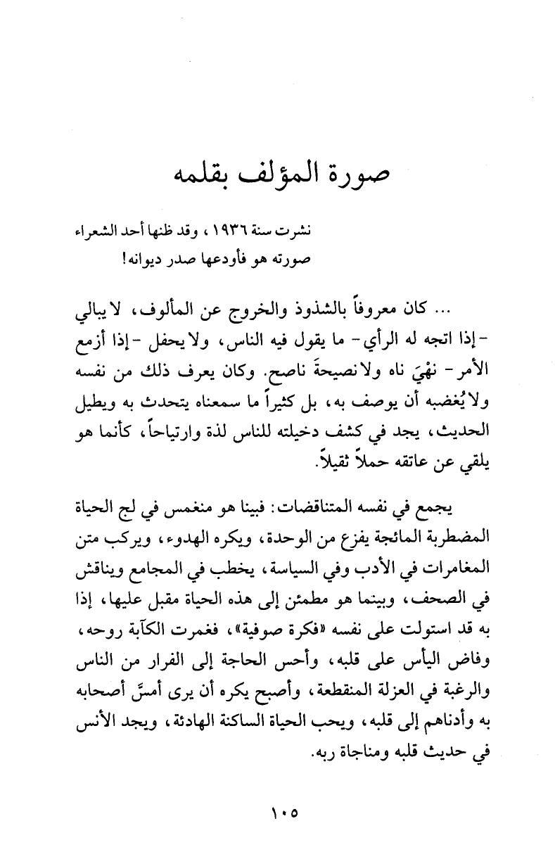 يجمع في نفسه المتناقضات: فبينا هو منغمس في لج الحياة المضطربة المائجة يفزع من الوحدة، ويكره الهدوء، ويركب متن المغامرات في الأدب وفي السياسة، يخطب في المجامع ويناقش في الصحف، وبينما هو مطمئن إلى هذه الحياة مقبل عليها، إذا به قد استولت على نفسه «فكرة صوفية»، فغمرت الكآبة روحه، وفاض اليأس على قلبه، وأحس الحاجة إلى الفرار من الناس والرغبة في العزلة المنقطعة، وأصبح يكره أن يرى أمسَّ أصحابه به وأدناهم إلى قلبه، ويحب الحياة الساكنة الهادئة، ويجد الأنس في حديث قلبه ومناجاة ربه.