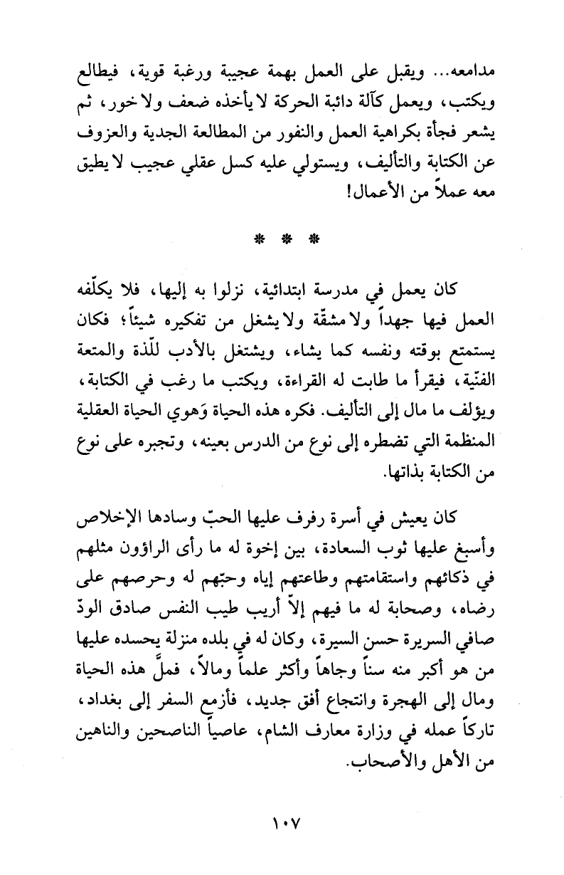 مدامعه ... ويقبل على العمل بهمة عجيبة ورغبة قوية، فيطالع ويكتب، ويعمل كآلة دائبة الحركة لا يأخذه ضعف ولا خور، ثم يشعر فجأة بكراهية العمل والنفور من المطالعة الجدية والعزوف عن الكتابة والتأليف، ويستولي عليه كسل عقلي عجيب لا يطيق معه عملاً من الأعمال!
