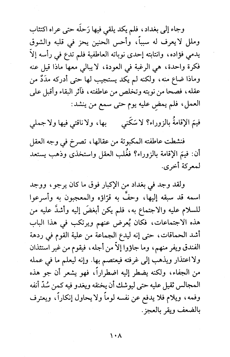 وجاء إلى بغداد، فلم يكد يلقي فيها رَحلَه حتى عراه اكتئاب وملل لا يعرف له سبباً، وأحس الحنين يحز في قلبه والشوق يدمي فؤاده، وانتابته إحدى نوباته العاطفية فلم تدع في رأسه إلاّ فكرة واحدة، هي الرغبة في العودة، لا يبالي معها ماذا قيل عنه وماذا ضاع منه، ولكنه لم يكد يستجيب لها حتى أدركه مدَدٌ من عقله، فصحا من نوبته وتخلص من عاطفته، فآثر البقاء وأقبل على العمل، فلم يمضِ عليه يوم حتى سمع من ينشد: