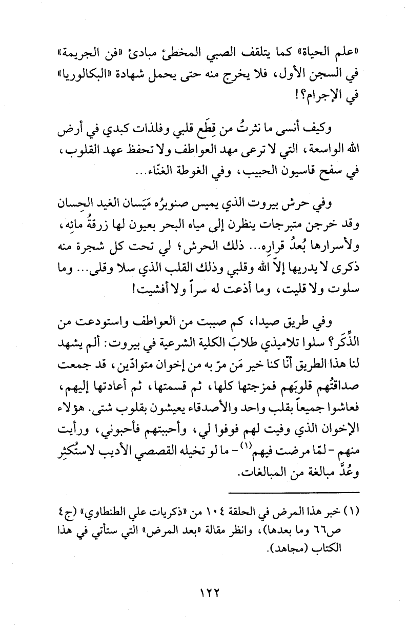 وفي حرش بيروت الذي يميس صنوبرُه مَيَسان الغيد الحِسان وقد خرجن متبرجات ينظرن إلى مياه البحر بعيون لها زرقةُ مائِه، ولأسرارها بُعدُ قرارِه ... ذلك الحرش؛ لي تحت كل شجرة منه ذكرى لا يدريها إلاّ الله وقلبي وذلك القلب الذي سلا وقلى ... وما سلوت ولا قليت، وما أذعت له سراً ولا أفشيت!