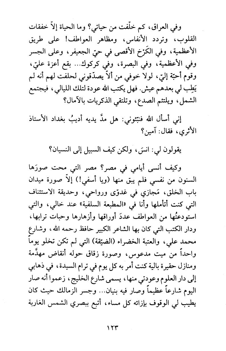 وفي العراق، كم خلّفت من حياتي؟ وما الحياة إلاّ خفقات القلوب، وتردد الأنفاس، ومظاهر العواطف! على طريق الأعظمية، وفي الكَرْخ الأقصى في حيّ الجعيفر، وعلى الجسر وفي الأعظمية، وفي البصرة، وفي كركوك ... بقع أعزة عليّ، وقوم أحبّة إليّ، لولا خوفي من ألاّ يصدّقوني لحلفت لهم أنه لم يَطِب لي بعدهم عيش. فهل يكتب الله عودة لتلك الليالي، فيجتمع الشمل، ويلتئم الصدع، وتلتقي الذكريات بالآمال؟