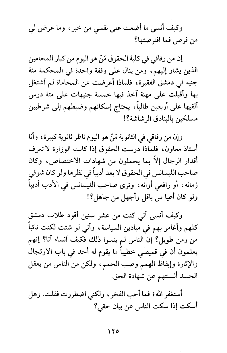إن من رفاقي في كلية الحقوق مَنْ هو اليوم من كبار المحامين الذين يشار إليهم، ومن ينال على وقفة واحدة في المحكمة مئة جنيه في دمشق الفقيرة، فلماذا أعرضت عن المحاماة لم أشتغل بها وأقبلت على مهنة آخذ فيها خمسة جنيهات على مئة درس ألقيها على أربعين طالباً، يحتاج إسكاتهم وضبطهم إلى شرطيين مسلحَين بالبنادق الرشاشة؟!