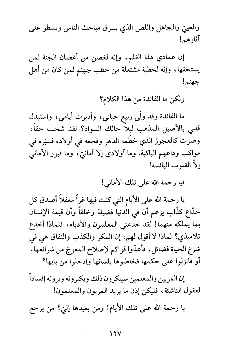 يا رحمة الله على الأيام التي كنت فيها غراً مغفلاً أصدق كل خدّاع كذّاب يزعم أن في الدنيا فضيلة وخلقاً وأن قيمة الإنسان بما يملكه منهما! لقد خدعني المعلمون والأدباء، فلماذا أخدع تلاميذي؟ لماذا لا أقول لهم: إن المكر والكذب والنفاق هي في شرع الحياة فضائل، فأعدّوا قواكم لإصلاح المعوجّ من شرائعها، أو فانزلوا على حكمها فخاطبوها بلسانها وادخلوا من بابها؟