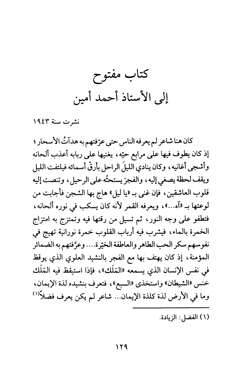 كان هنا شاعر لم يعرفه الناس حتى عرّفتهم به هدآتُ الأسحار؛ إذ كان يطوف فيها على مرابع حيّه، يغنيها على ربابه أعذب ألحانه وأشجى أغانيه، وكان ينادي الليلَ الراحل بأرقّ أسمائه فيلتفت الليل ويقف لحظة يصغي إليه، والفجرَ يستحثّه على الرحيل، وتنصت إليه قلوب العاشقين، فإن غنى بـ «يا ليل» هاج بها الشجن فأجابت من لوعتها بـ «آه ...»، ويعرفه القمر لأنه كان يسكب في نوره ألحانه، فتطفو على وجه النور، ثم تسيل من رقتها فيه وتمتزج به امتزاج الخمرة بالماء، فيشرب فيه أرباب القلوب خمرة نورانية تهيج في نفوسهم سكر الحب الطاهر والعاطفة الخيّرة .... وعرَّفتهم به الضمائر المؤمنة، إذ كان يهتف بها مع الفجر بالنشيد العلوي الذي يوقظ في نفس الإنسان الذي يسمعه «المَلَك»، فإذا استيقظ فيه المَلَك خنس «الشيطان» واستخذى «السبع»، فتعرف بنشيده لذة الإيمان، وما في الأرض لذة كلذة الإيمان ... شاعر لم يكن يعرف فضلاً (¬1)