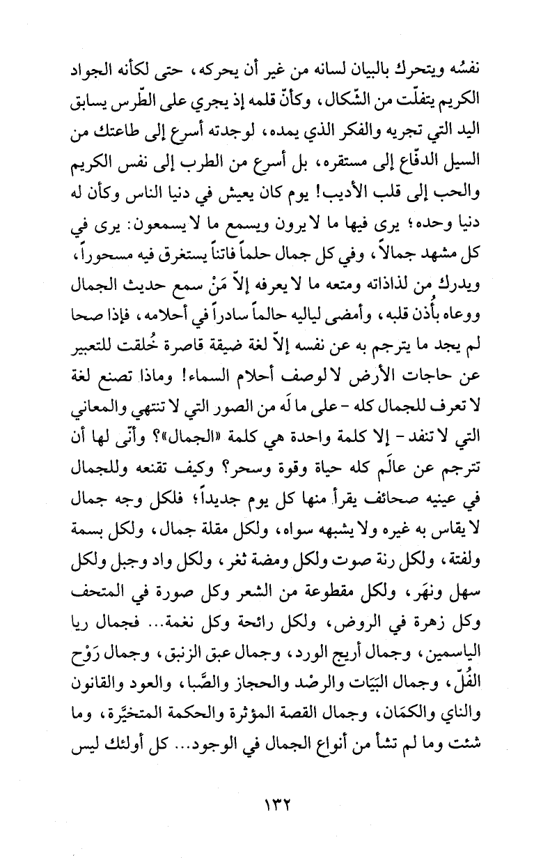 نفسُه ويتحرك بالبيان لسانه من غير أن يحركه، حتى لكأنه الجواد الكريم يتفلّت من الشّكال، وكأنّ قلمه إذ يجري على الطّرس يسابق اليد التي تجريه والفكر الذي يمده، لوجدته أسرع إلى طاعتك من السيل الدفّاع إلى مستقره، بل أسرع من الطرب إلى نفس الكريم والحب إلى قلب الأديب! يوم كان يعيش في دنيا الناس وكأن له دنيا وحده؛ يرى فيها ما لا يرون ويسمع ما لا يسمعون: يرى في كل مشهد جمالاً، وفي كل جمال حلماً فاتناً يستغرق فيه مسحوراً، ويدرك من لذاذاته ومتعه ما لا يعرفه إلاّ مَنْ سمع حديث الجمال ووعاه بأُذن قلبه، وأمضى لياليه حالماً سادراً في أحلامه، فإذا صحا لم يجد ما يترجم به عن نفسه إلاّ لغة ضيقة قاصرة خُلقت للتعبير عن حاجات الأرض لا لوصف أحلام السماء! وماذا تصنع لغة لا تعرف للجمال كله -على ما لَه من الصور التي لا تنتهي والمعاني التي لا تنفد- إلا كلمة واحدة هي كلمة «الجمال»؟ وأنّى لها أن تترجم عن عالَم كله حياة وقوة وسحر؟ وكيف تقنعه وللجمال في عينيه صحائف يقرأ منها كل يوم جديداً؛ فلكل وجه جمال لا يقاس به غيره ولا يشبهه سواه، ولكل مقلة جمال، ولكل بسمة ولفتة، ولكل رنة صوت ولكل ومضة ثغر، ولكل واد وجبل ولكل سهل ونهَر، ولكل مقطوعة من الشعر وكل صورة في المتحف وكل زهرة في الروض، ولكل رائحة وكل نغمة ... فجمال ريا الياسمين، وجمال أريج الورد، وجمال عبق الزنبق، وجمال رَوْح الفُلّ، وجمال البَيَات والرصْد والحجاز والصَّبا، والعود والقانون والناي والكمَان، وجمال القصة المؤثرة والحكمة المتخيَّرة، وما شئت وما لم تشأ من أنواع الجمال في الوجود ... كل أولئك ليس